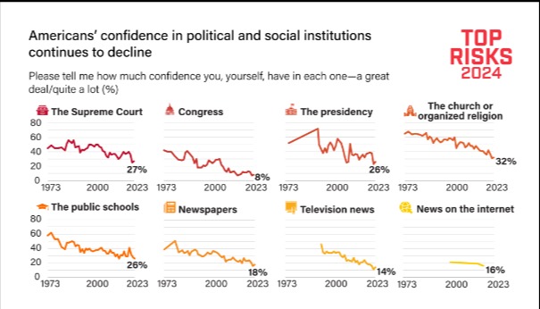世界邁入超級選舉年,70多個國家和地區將進行的關鍵選舉,無庸置疑將左右世界格局。其中有一個選舉,被稱為2024年全球“頭號”政治風險,那就是將於11月舉行的美國大選。 國際諮詢機構歐亞集團近日發佈報告,將美國總統大選排在2024年全球主要政治風險的首位。報告稱,美國已是全球最分裂、功能失調最嚴重的“先進工業民主國家”,無論選舉結果如何,都將加劇其國內分裂。