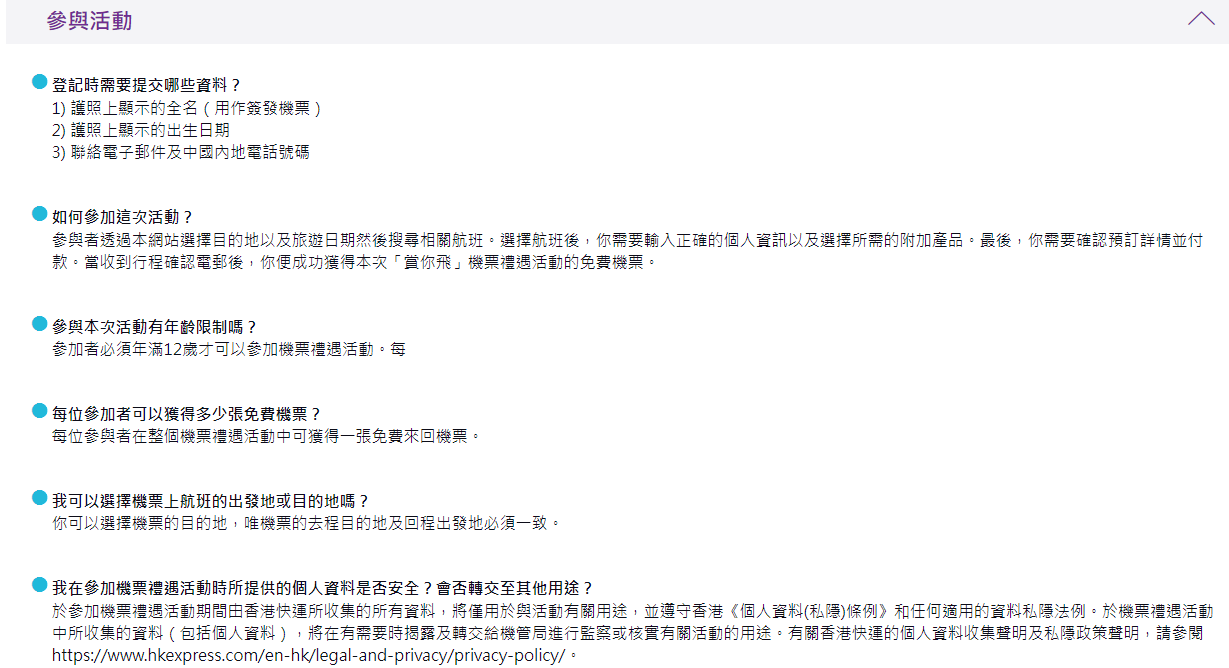 香港快運圖片。 香港快運在官方網頁公布,活動於1月17日至1月19日進行,參加者必須通常居住於內地並持有效旅遊證件,並在預訂當日已年滿12歲。另外活動亦要求參加者持有效的電郵地址,及有效的內地電話號碼。