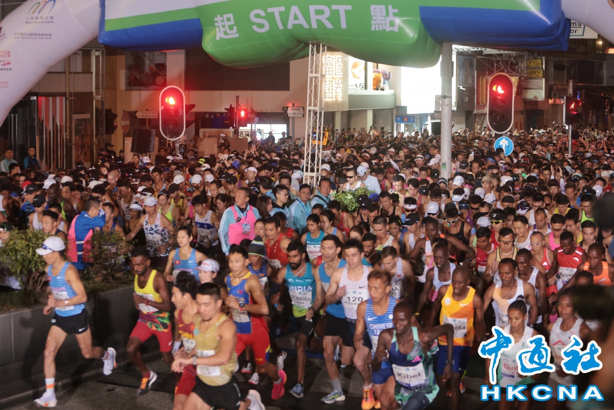 (香港中通社記者 謝光磊 攝) “半馬”事和10公里賽事率先在清晨5時40分開跑,“全馬”則在清晨6時起步。其中“全馬”及“半馬”賽事以尖沙咀彌敦道作為起點,10公里賽事則在東區走廊起步,所有賽事的終點均為銅鑼灣維多利亞公園。不少跑手凌晨時分已抵達起點附近熱身。受東北季候風影響,香港天氣今天顯著轉涼,市區今早最低氣溫約15度,新界再低兩三度。有跑手表示,今天的天氣很乾爽,非常適合跑步,又指已經備戰數個月;另有跑手認為,今年的氣氛較佳,身邊亦有不少朋友參與這項盛事。