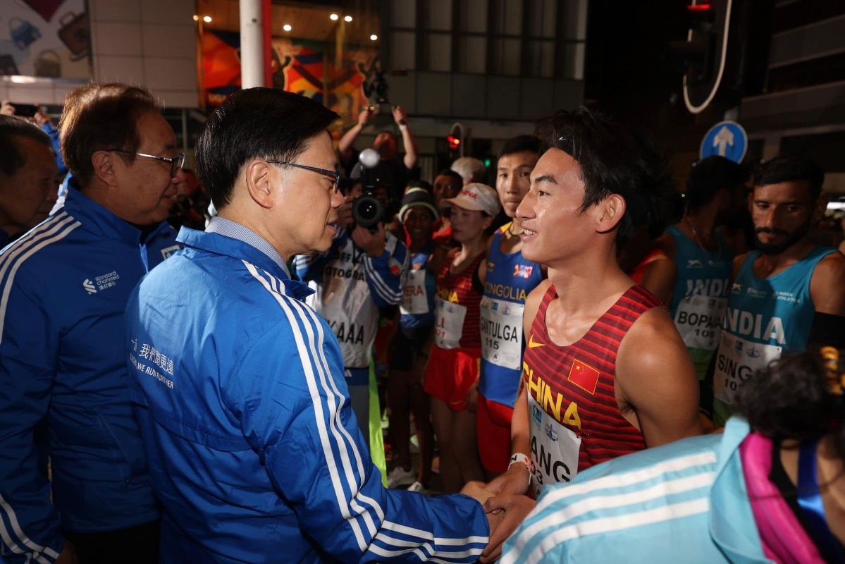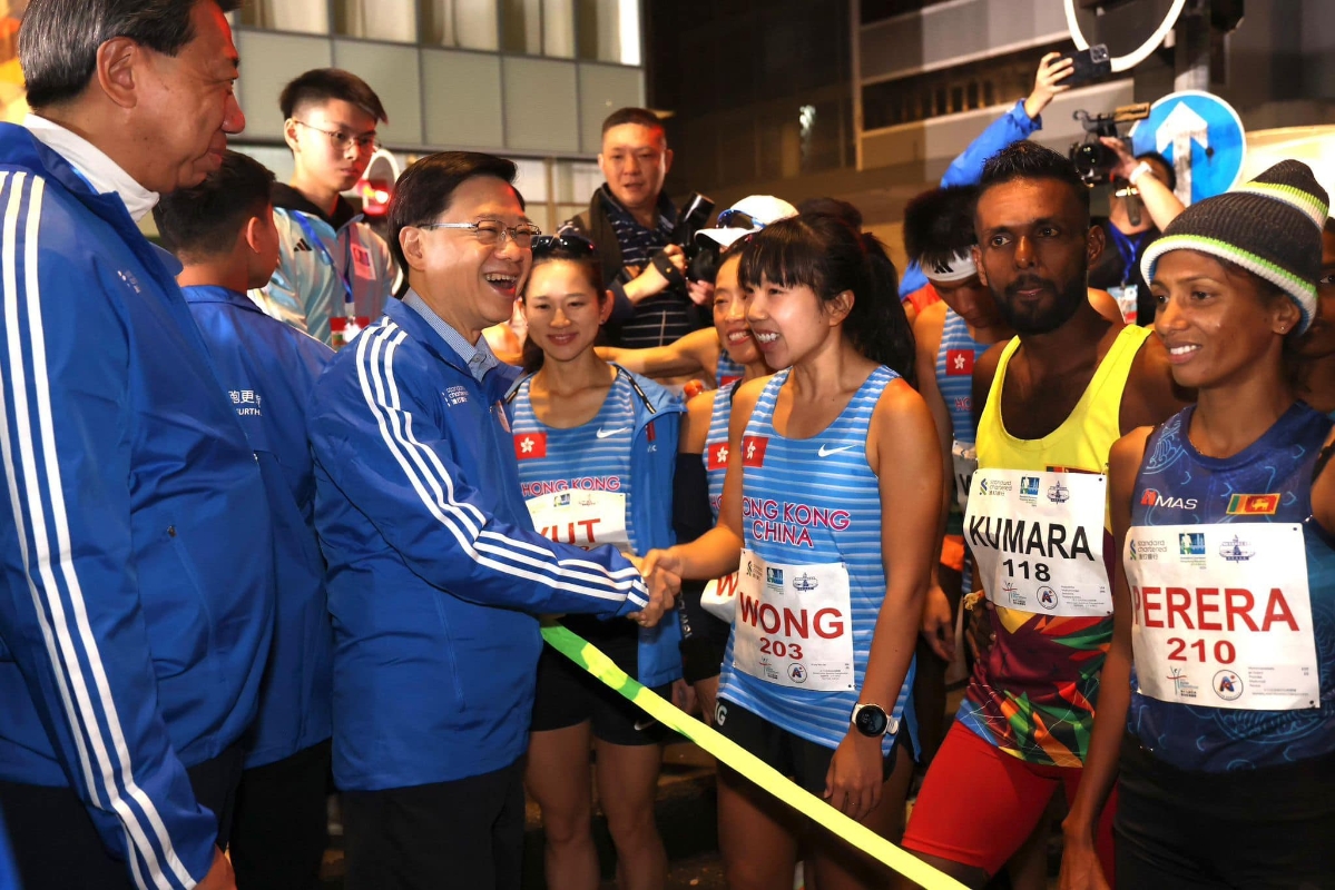 (香港中通社記者 謝光磊 攝) 香港特區行政長官李家超及警務處處長蕭澤頤等今早到尖沙咀主持起步禮,並於起步前與跑手握手交流。李家超隨後在社交平台發文表示,很高興看到2024年的香港盛事連連,不單為市民掀起一浪浪的歡樂氣氛,亦能吸引海外旅客來港,振興本港經濟。他強調特區政府會繼續推動、推廣在港舉行國際大型盛事,展現香港盛事之都的魅力,鞏固香港的國際城市地位。