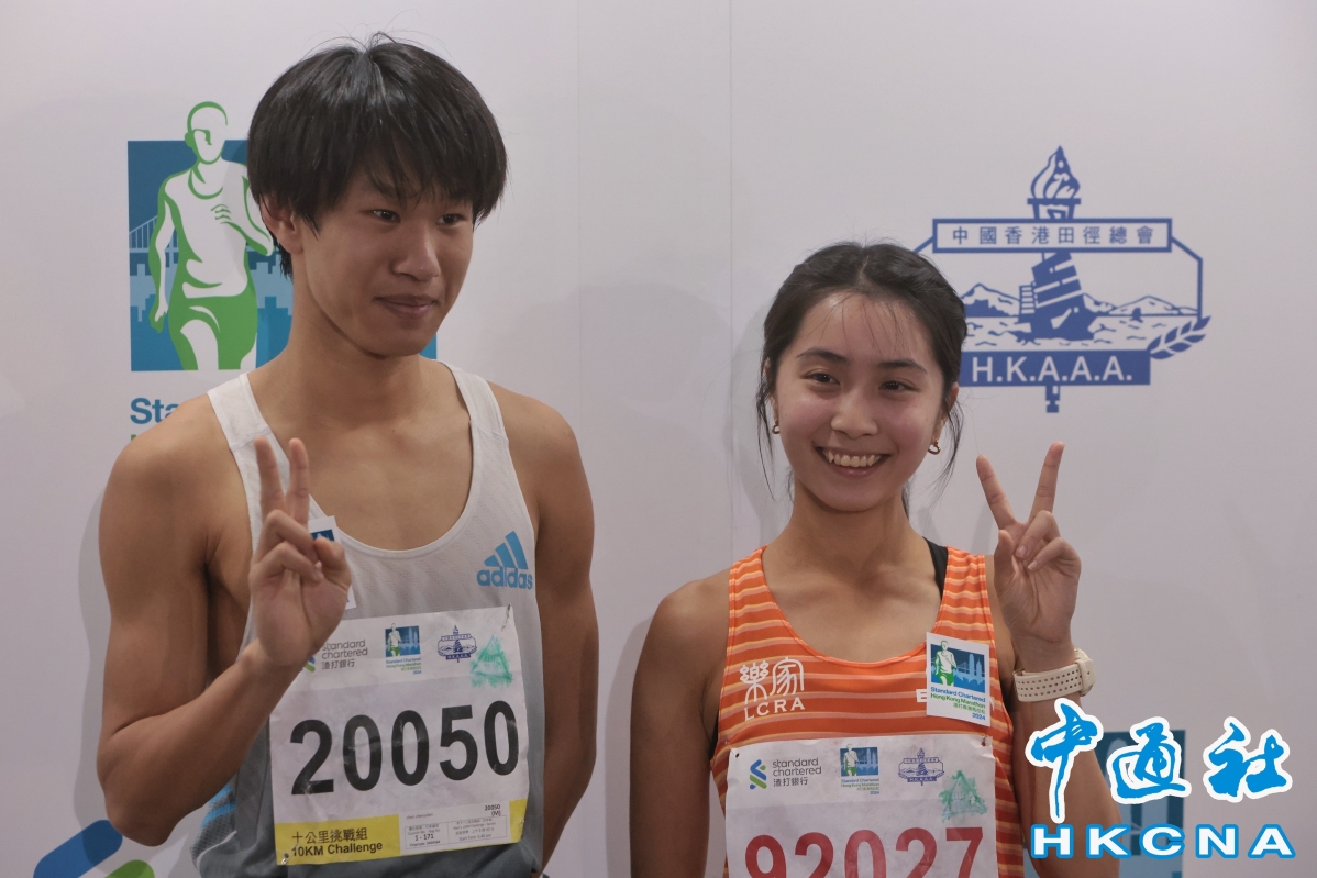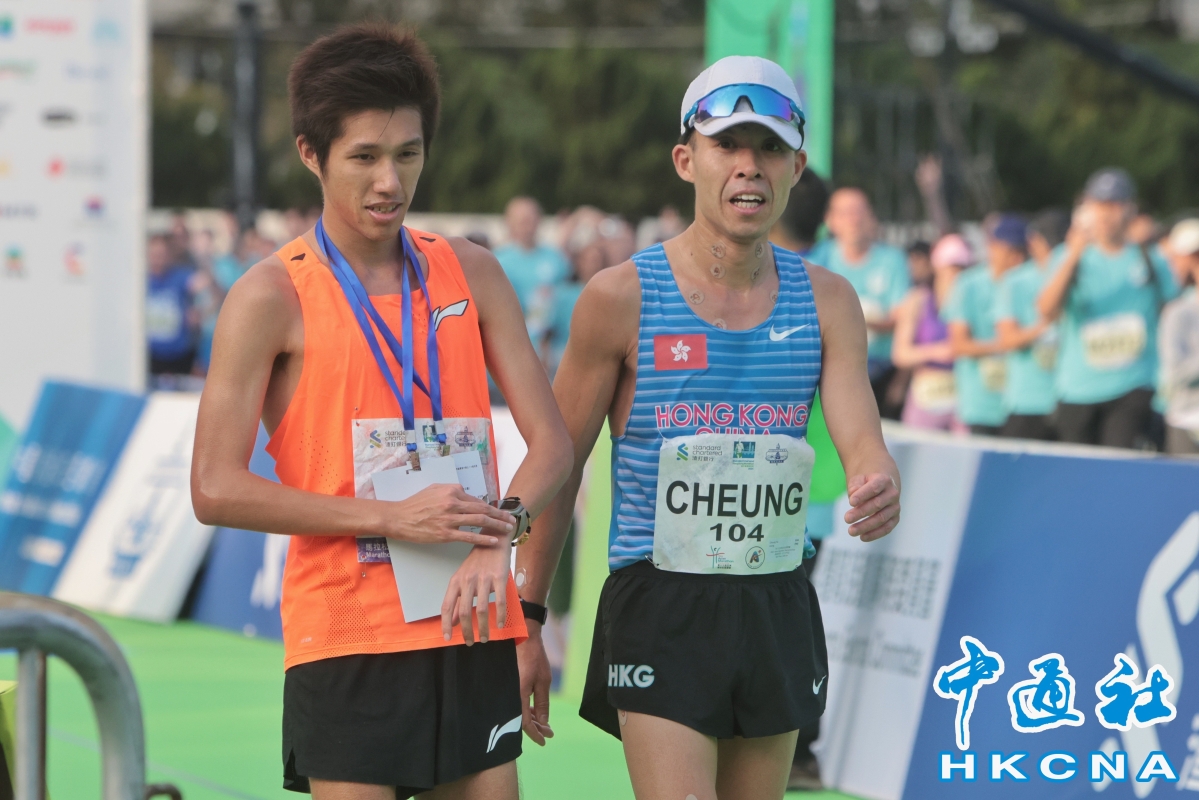 黃尹雋(左)、張耀樑(右)是第二快的香港跑手。(香港中通社記者 謝光磊 攝) 她表示,今次是自己產後首次越級挑戰全馬,惟今日狀態不算最好,跑到中途時側腹疼痛,只能減速,而餘下路段就在“減速與加速之間”完成。