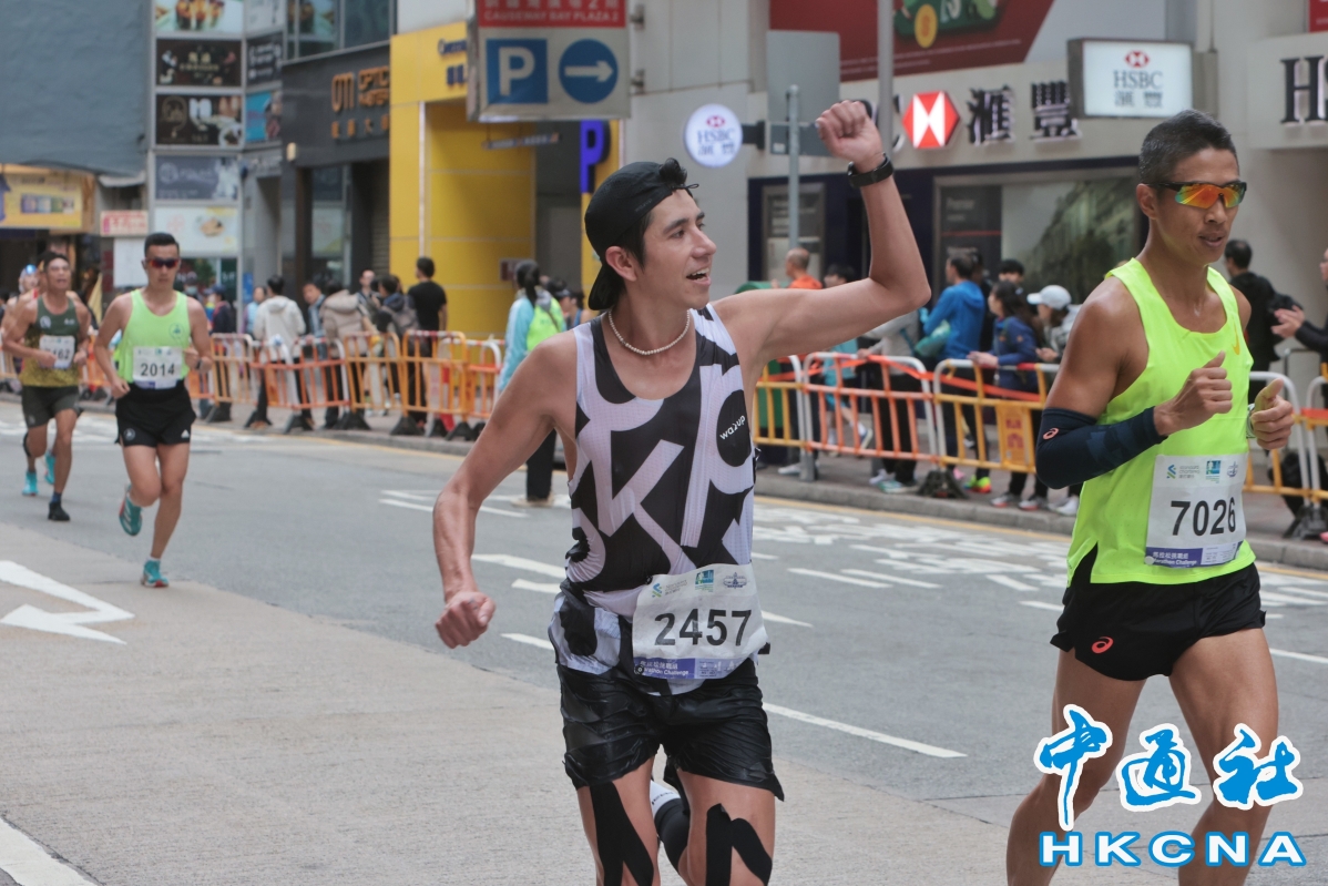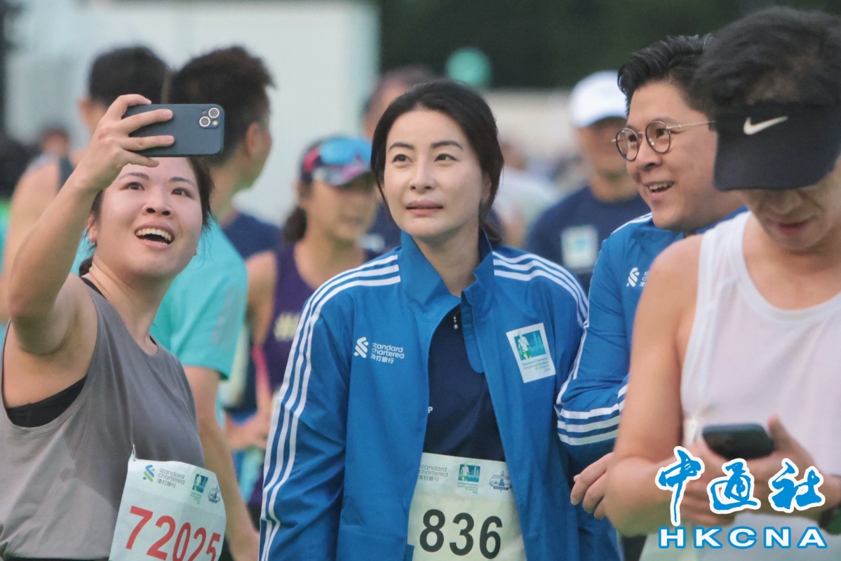 (香港中通社記者 謝光磊 攝) 另外,渣打亞洲區行政總裁洪丕正、“蘭桂坊之父”盛智文等亦有參與。而立法會體演文出界議員霍啟剛及其夫人郭晶晶更攜手衝過終點線,賽後不少跑手爭相與他們合影。