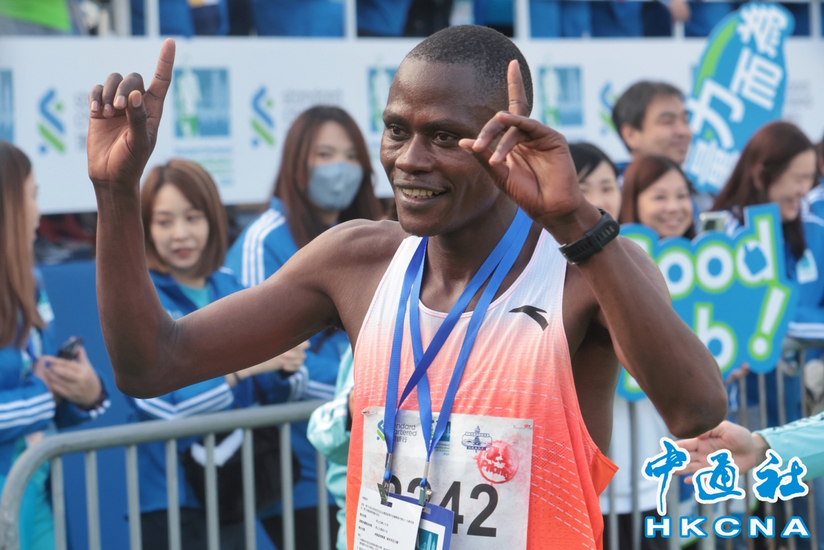 30歲的肯亞跑手Seroi Anderson首先衝線。(香港中通社記者 謝光磊 攝) 而本地跑手方面,全馬男子組黃尹雋以2小時23分23秒衝線,成為今屆渣馬全馬最快的香港跑手,全場排第15位。他開心表示,人生清單上再完成一項事情,明年會繼續參賽,認為這是作為香港運動員的義務。而全馬的本地女跑手由姚潔貞以2小時41分09秒完成,取得最佳成績。