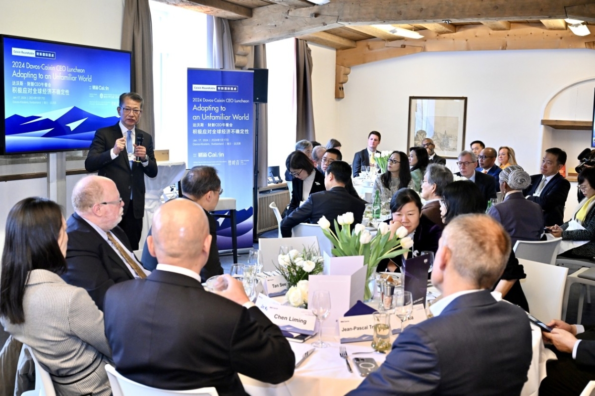 陳茂波出席世界經濟論壇年會期間,在“達沃斯‧財新CEO午餐會”上致辭。陳茂波網誌圖片 陳茂波撰文表示,過去一周,他在瑞士達沃斯參與世界經濟論壇年會,期間出席了一系列的會議、專題小組、餐會、圓桌會議等,與不同國家的政府首長、財金官員、國際組織的主要負責人,以及工商專業界代表會面,除了討論雙方關心的議題外,也向他們介紹香港最新的經濟和社會狀況,以及新的發展機遇。總的來說,達沃斯此行達到了預期的目標,包括說好香港故事、說好中國故事;擴大香港的朋友圈,建立更多的聯繫;以及為未來招商引資、開拓新市場的工作鋪路。