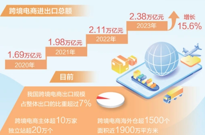 香港新聞網1月22日電 越來越多的中國企業將目光投向海外市場,尋求更大發展空間,跨境電商出口正是其中一條重要路徑。跨境電商作為發展速度最快、潛力最大、帶動作用最強的外貿新業態,顯示出巨大的市場活力和增長韌性。據中國海關測算,2023年,中國跨境電商進出口總額2.38萬億元,增長15.6%。其中,出口1.83萬億元,增長19.6%;進口5483億元,增長3.9%。