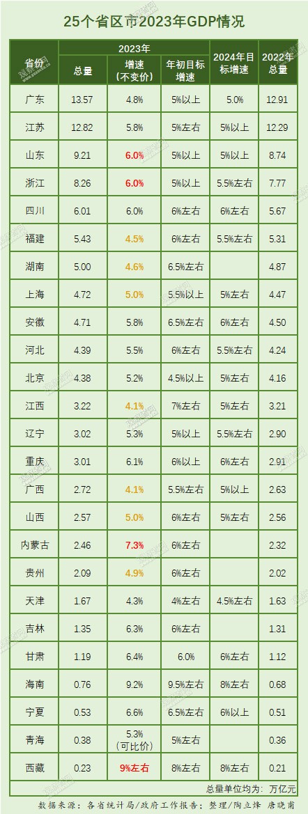 看點頗多!中國25省份公佈去年GDP香港新聞網1月24日電 伴隨著2024年地方“兩會”相繼召開,中國各省份也陸續披露了2023年的主要經濟數據和2024年的經濟發展目標。 截至發稿,已有25個省份公佈了其2023年GDP具體數據,其中20個省份在政府工作報告中也提出了2024年的增速目標。