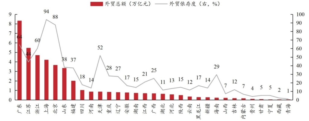 25個省份2023年GDP情況(其中西藏數據為預估情況) 長期以來珠三角和長三角就是中國經濟活力最強的兩個地區,2023年廣東和江蘇兩省持續穩定增長,創造新紀錄。 廣東GDP於2023年首次突破13萬億大關,這也是其GDP連續35年全國第一。分產業看,2023年廣東第一產業增加值5540.70億元,增長4.8%;第二產業54437.26億元,增長4.8%;第三產業75695.21億元,增長4.7%。 廣東在消費、工業等方面表現十分亮眼。消費方面,2023年社會消費品零售總額達4.7萬億元、增長5.8%,深圳成為廣東第二個萬億元消費城市。 工業方面,廣東省工業投資連續36個月保持兩位數增長,製造業增加值佔地區生產總值比重達32.7%,佛山成為廣東第二個規模以上工業總產值突破3萬億元的城市。 受到工業和研發需求的拉動,廣東省第三產業發展勢頭良好,金融業增加值突破1.2萬億元。現代服務業增加值佔服務業比重達65%。科技信貸餘額超2.3萬億元、規模居全國首位,知識產權質押融資達2307億元、同比翻了一番。 作為中國外貿大省,近幾年來,廣東省的對外貿易依存度一直保持在60%以上。2023年,廣東持續保持對外貿的高度依賴。 2023年,廣東省外貿進出口總值再創歷史新高,達8.3萬億元,佔全國的19.9%,繼續穩居全國外貿第一大省。其中,出口5.4萬億元,增長2.5%;進口2.9萬億元,下降3.6%。跨境電商進出口總額突破8000億元、佔全國超1/3。電動汽車、鋰電池、太陽能電池“新三樣”產品出口分別增長229%、15.9%、22.6%。2023粵港澳大灣區全球招商大會達成項目859個、總金額2.24萬億元。 外貿成就了廣東的輝煌,但是受限於國際地緣政治局勢變化和世界經濟需求變緩,廣東省經濟發展正在進一步承壓。2023年,廣東省外貿進出口總值只同比增長0.3%。 廣東外貿依存度最高的城市東莞在2022年外貿依存度高達124.3%。作為省內外貿規模第二大城市,它直到10月才扭轉了之前三個季度同比下滑的態勢,同比迎來正增長。隨後在12月份進出口1164.6億元,同比增長11.5%,增速達年內峰值。 為了應對相關結構性變化,廣東省政府正在推進省內企業轉型升級。根據政府工作報告工作報告透露,廣東2023年技改投資增幅創6年新高。2024年,廣東將新推動9200家規模以上工業企業數字化轉型,遴選一批“鏈主”企業和專精特新企業,新培育超250家省級製造業單項冠軍企業,新推動5500家以上企業“小升規”。隨著未來相關改革推進,自主創新能力加強,廣東省內企業國際國內競爭力將進一步提高。廣東省經濟發展將迎來新一輪成長期。 同樣正在加速轉型升級的還有長三角地區。 2023年,江蘇以12.82萬億元的經濟規模穩坐“第二把交椅”。同時,以常州加入“萬億俱樂部”為標誌,江蘇省內GDP破萬億的市已達到5個(蘇州、南京、無錫、南通、常州)。