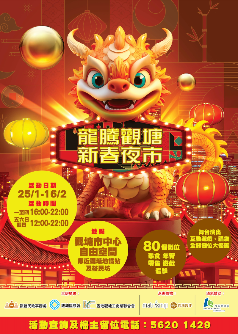 香港“日夜都繽紛”! 新春25個精彩活動一文看香港新聞網1月26日電 為提升節日氣氛及提振地區經濟,香港民政事務總署連同18區民政事務處及區議會,以“日夜都繽紛”為主題,即日(26日)起在全港各區舉辦連串活動,涵蓋新春夜市、綵燈會等。香港新聞網為讀者整理新春期間的25個活動詳情,讓大家可以在節日中玩得盡慶。 1月活動:龍騰觀塘新春夜巿 當中打響頭炮的活動就是“龍騰觀塘新春夜巿”於1月25日起至2月16日在觀塘市中心自由空間(裕民坊)舉行。夜間市集有80個攤位,包括熟食、零售、互動遊戲、舞台表演等,更大派福袋!活動時間為周一至周四下午4時至晚上10時;周五至周日及假日中午12時至晚上10時。