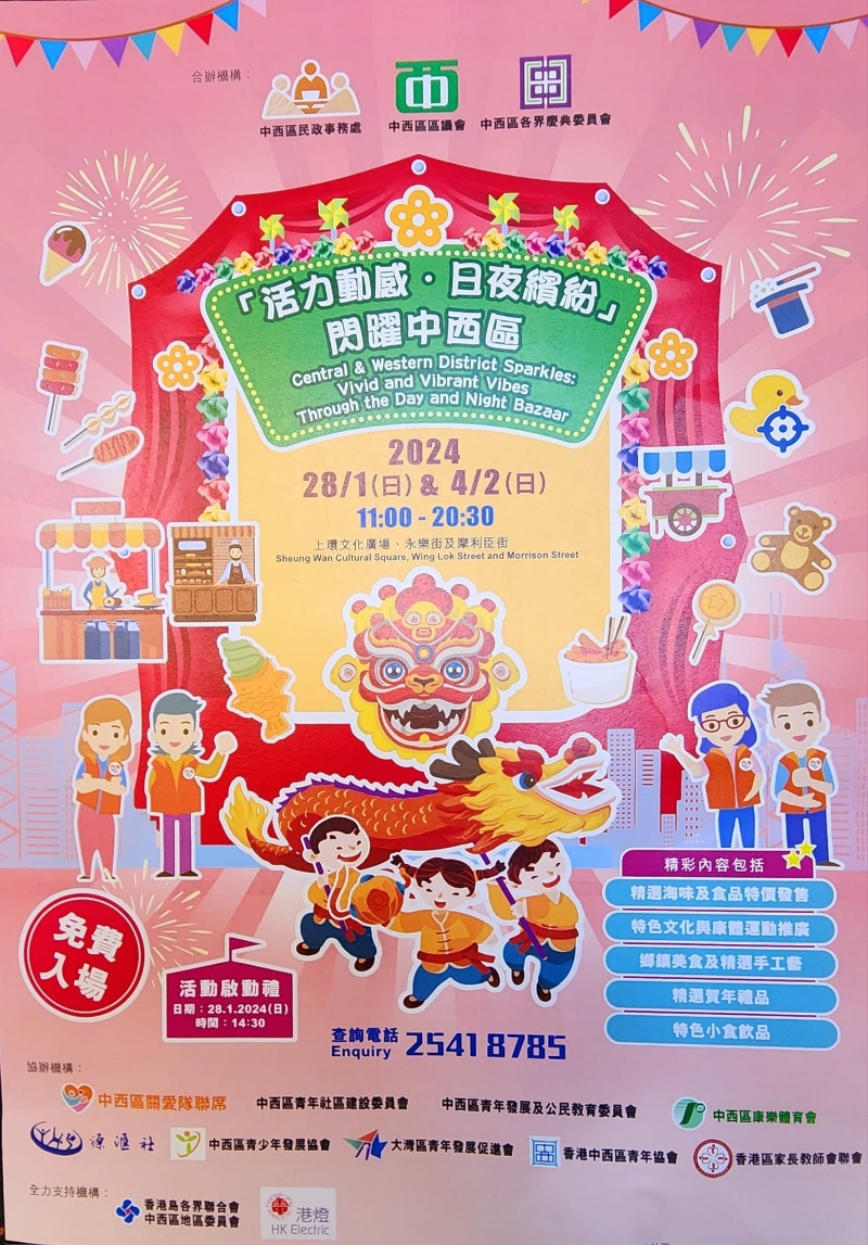 “活力動感.日夜繽紛”閃躍中西區 活動於1月28日及2月4日的早上11時至晚上8時半在上環文化廣場、永樂街及摩利臣街舉行,設置數十個售賣各式各樣貨品的攤檔,包括海味及特色小食、鄉鎮美食手工藝,部分貨品會以優惠價出售。活動上亦會安排多元的青年文化藝術表演及新興運動體驗。為與市民喜迎龍年,場內更會安排充滿節慶特色的傳統文化項目。
