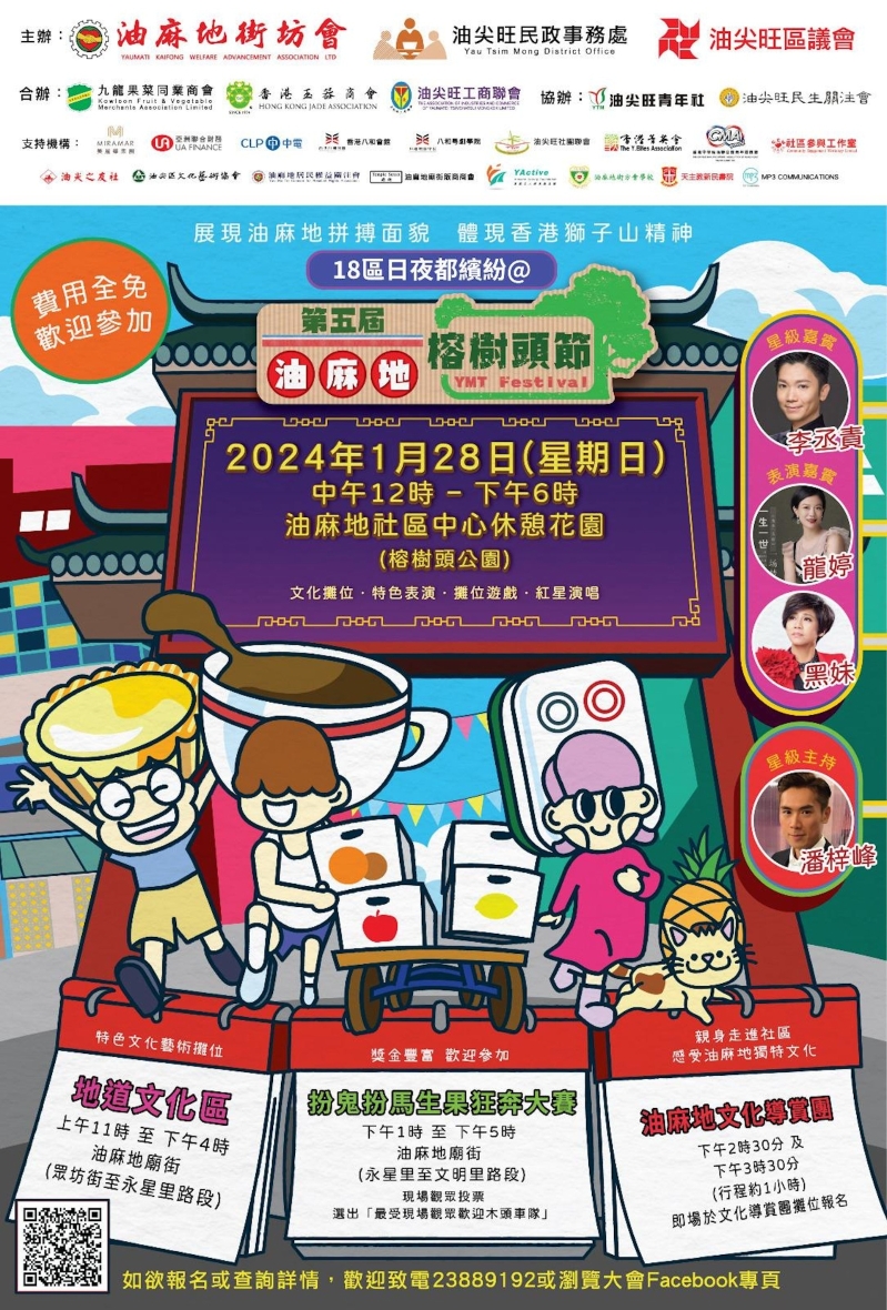 油麻地榕樹頭節 活動於1月28日的中午12時至傍晚6時,在油麻地社區中心休憩花園(榕樹頭公園)、廟街及鴉打街臨時遊樂場舉行。活動配合廟街夜市,旨在讓市民及外地遊客認識日間油麻地的特色、區內文化、歷史和發展,內容包括榕樹頭公園嘉年華會、地道文化區攤位展覽、扮鬼扮馬生果格蘭披治大賽車、敬老盆菜晚宴及文化導賞團。另外活動更邀請了玄學家李丞責、歌手黑妹(李麗霞)、以及《中年好聲音》歌手龍婷出席。