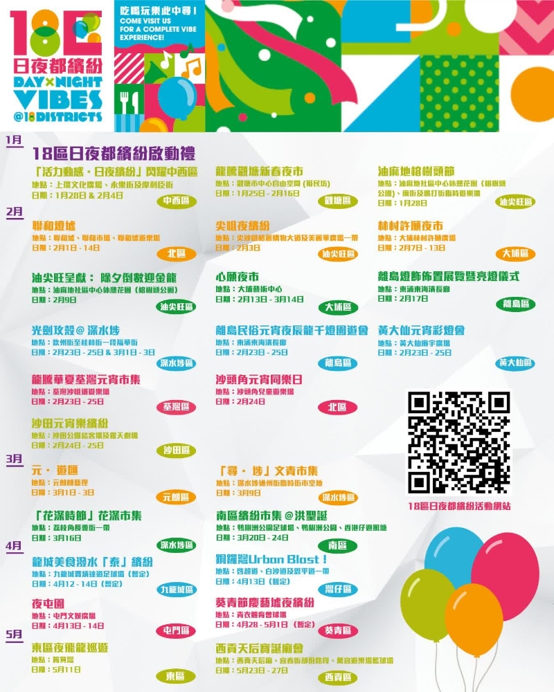 3月活動:元。遊匯 3月1日至3日在元朗朗藝徑舉辦城鄉共融的大型墟市,推廣具地區特色的商品,如傳統美食、手工製品及農產品等。現場亦設打卡位,並安排一系列精彩的藝術文化表演,邀請年輕人及少數族裔參與,為元朗居民帶來日夜都繽紛的氣氛。 “尋·埗”文青市集 市集於3月9日在深水埗通州街臨時街市空地舉行,以設計創意產品為主題,帶動人流認識及沉浸於本地設計產品和深水埗紡織布藝文化,同時推動深水埗成為創意經濟的核心區。 “花深時節”花深巿集 市集於3月16日在荔枝角長義街一帶舉行,以深水埗的花季為引子,吸引市民及遊客到訪深水埗區不同地點賞花,以推動地區經濟。現場除設有花藝特色打卡位及街頭表演外,亦會售賣以花為主題的糕點小食、雪糕甜品及花藝裝飾小擺設等,各攤檔將派發餐飲及消費優惠券。 南區繽紛市集@洪聖誕 鴨脷洲洪聖賀誕活動於每年農曆二月舉行,並已列入香港非物質文化遺產。為配合地區經濟及南區傳統文化的推廣活動,除了以往的放祈福水燈、龍舟拜廟、賀誕巡遊、神功戲表演外,今年的賀誕活動更會增設市集。市集於3月20日至24日在鴨脷洲公園足球場、鴨脷洲公園、香港仔避風塘舉行。為響應“香港夜繽紛”活動,會延長市集開放時間。另外,市集會邀請地區團體、社會企業和食肆參與,藉此推廣南區特色和美食,以及推動區內消費。 4月活動:龍城美食潑水“泰”繽紛 活動暫定於4月12日至14日在九龍城賈炳達道足球場肇行。活動旨在透過向市民提供地道的泰式美食、歌舞、泰拳比賽等文化體驗,輔以精彩活動和宣傳,推廣九龍城地區的食、買、玩特色。此外,香港九龍城工商業聯會將會聯同九龍城區的商戶,向市民提供各式各樣的電子消費優惠及回饋,並新增夜市特別優惠。 銅鑼灣Urban Blast! 活動暫定於4月13日在啓超道、白沙道、恩平道舉行,會在街頭設置音樂角落、潮流市集、露天飲食專區等,帶動人流。 夜屯園 活動於4月13日及14日在屯門文娛廣場舉行,設有20多個售賣不同產品、小食和飲品的攤檔、現場音樂表演,及擺放裝置藝術品,將屯門文娛廣場變身為夜間文娛及藝術展覽場地。同時,邀請屯門文娛廣場附近大型商場配合活動,推出消費及飲食優惠。 葵青節慶藝墟夜繽紛 活動暫定於4月28日至5月1日在青衣體育會球場(青衣青綠街38號)舉行。會邀請地區團體及學校設置不同型式的攤檔,售賣傳統及新穎的特色小食及手工藝品,並利用戲棚作演出場地,上演不同主題類型的表演節目,如粵劇神功戲等。 5月活動:東區夜飛龍巡遊 巡遊於5月11日在筲箕灣上演。今次是譚公誕期間首次於晚上舉行富有東區特色的夜光舞龍及舞獅表演,附近商戶將於活動期間推出一連串限定飲食和消費優惠,在社區營造開心快樂的氣氛,同時振興夜經濟。 西貢天后寶誕廟會 活動於5月23至27日在西貢天后廟、宜春街部份路段、萬宜遊樂場籃球場舉行。活動包括酬神粵劇、龍獅麒麟匯演、數十個攤檔的美食文化市集等,另邀請攤檔及區內商戶參與天后誕特別“節”扣優惠,並推出西貢漁村或富藝術文化的特色手信。附近的西貢公立學校亦會舉行天后誕展覽及市集,發揮協同效應,推廣傳統節慶文化。 【編輯:孟宜君】