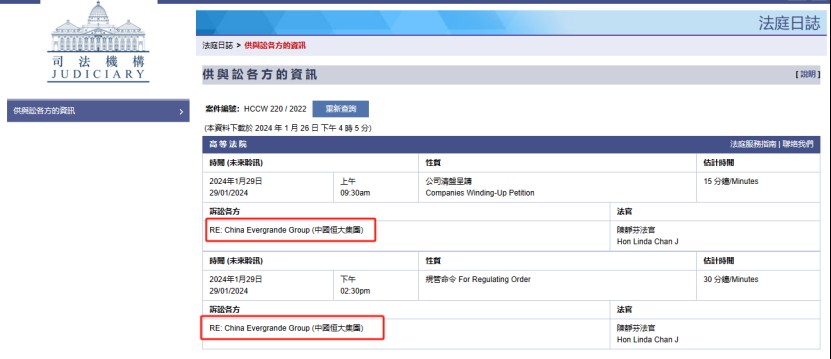 香港新聞網1月27日電 香港高等法院將於2024年1月29日9時30分舉行針對中國恒大集團的清盤呈請聆訊,這是其第七次發佈清盤呈請聆訊延期。法官陳靜芬將於下周一下午2時30分就一項潛在的規管命令舉行聆訊。此類規管令若生效,意味著法院將監管清盤程序,可能包括任命清盤人。 據中國香港司法機構網站,香港高等法院將於2024年1月29日9時30分舉行針對中國恒大集團的清盤呈請聆訊。此次聆訊被認為是恒大的生死時刻。其實早在2024年年前恒大就面臨是否破產的生死時刻。按照一般的判案程序,如果恒大此次還不能够提出一個可以被法庭和債權人接受的方案,可能恒大這一次就要面臨破產命運。