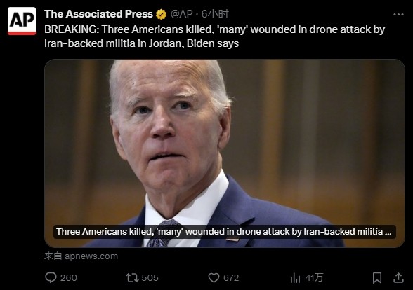 拜登28日發表講話,劍指伊朗。社交媒體X截圖 據多名知情美國官員證實,襲擊發生在約旦靠近叙利亞邊境的一個小型美軍基地“22號塔”。 該基地主要由參與為約旦軍隊提供咨詢和援助任務的美軍部隊使用。目前約有3000名美軍士兵駐扎在約旦各地,但約旦沒有公開過這支美軍部隊的具體信息,美方也沒有透露過“22號塔”的駐扎人數。 有三名美國官員透露,無人機襲擊的地點靠近基地的宿營地,因此導致大量人員傷亡。截至目前,此次襲擊已導致3名士兵死亡,超30人受傷。隨著更多人員尋求治療,受傷人數預計還會上昇。目前還不清楚為什麼該基地的防空系統未能攔截無人機。 美聯社稱,這是本輪巴以衝突後,駐約旦美軍首次遭遇襲擊,也是首次有美軍士兵喪生。自2023年10月7日以來,該地區多支民兵組織使用無人機、火箭、迫擊炮和彈道導彈對美國在伊拉克的軍事設施發動了60多次襲擊,對美軍在叙利亞的軍事設施發動了90多次襲擊。近幾個月以來,美軍打擊了位於伊拉克、叙利亞和也門的目標,作為回應。