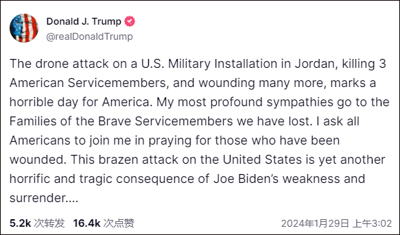 特朗普社交媒體貼文截圖 半島電視台援引一名美國官員的話稱,美國方面將此事件視作地區衝突的“嚴重昇級”。 前五角大樓阿拉伯半島事務主任德斯·羅切斯(David Des Roches)表示,美國政府的反應“將是重大的”。他分析說:“我認為美國不會僅僅針對代理人……這是一種很難正確計算的微積分,充滿了危險。最大的危險是雙方可能會製造出一種不必要的勢頭,導致一場雙方都不想發生的對抗。” 伊朗裔美國人全國委員會(NIAC)呼籲美國和伊朗保持克制,同時警告雙方“現在更接近被加沙衝突引發的暴力漩渦拖入全面地區戰爭的邊緣”。該組織主席表示,拜登必須展現領導力,認識到“這場危機沒有任何軍事解決方案,只會因軍事昇級和缺乏外交而擴大和延長”。(完) 【編輯:豐悅】