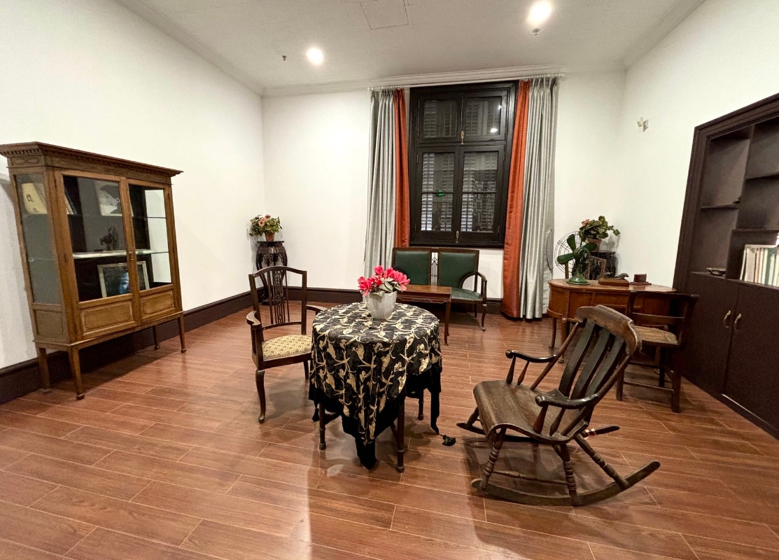 “石門二路街道社區文化活動中心”沿街的大門入口。 比起常德公寓只能參觀外觀,“大隱隱於市”的石門二路街道社區中心,卻面向所有人開放參觀,工作人員還會熱情地向來訪者介紹可參觀的區域。 進門後,左邊是服務台,右側有一間小型閱覽室,吸引了附近居民來這裡讀書看報。 沿閱覽室往裡走,社區中心在此特闢“張愛玲書屋”,明式書櫃、老相片、桌椅、茶几,簡單的幾樣老家具和一些照片,還原了張愛玲當年的讀書氣氛,使更多普通人走近了張愛玲,老上海的文化符號在張愛玲作品的“原鄉”綻放。