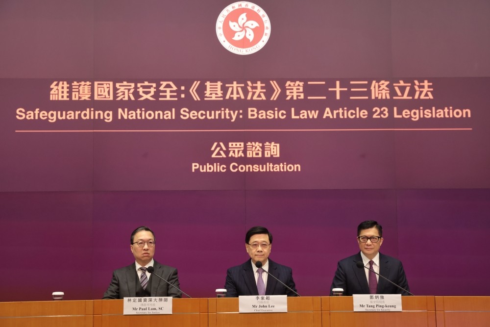(香港中通社 謝光磊攝) 李家超強調,希望可以盡快完成第23條立法,將這個纏繞香港26年的問題寫上句號,讓香港可以盡早全神貫注,聚焦拼經濟、拼發展,讓市民分享更多經濟紅利。 據咨詢文件建議的罪行,涵蓋五大類危害國家安全的行為和活動,包括: (1)叛國及相關行為; (2)叛亂、煽惑叛變及離叛,以及具煽動意圖的行為; (3)竊取國家機密及間諜行為; (4)危害國家安全的破壞等活動;及 (5)境外干預及從事危害國家安全活動的組織; 保安局局長鄧炳強詳細說明,建議仿效其他國家的法律,引入“叛亂”罪;建議完善現行間諜罪行,以涵蓋現代間諜活動;研究新增透過計算機或電子系統進行危害國家安全的罪行;建議訂立 “境外干預”罪等。 香港基本法委員會委員陳弘毅接受中通社記者采訪表示,今次的立法較為全面和深入。歐美國家最新的國安法都有處理破壞活動、計算機和電子系統活動和防止外國干預的問題,認為咨詢文件對於這些方面的建議也是符合國際上的國安立法趨勢。