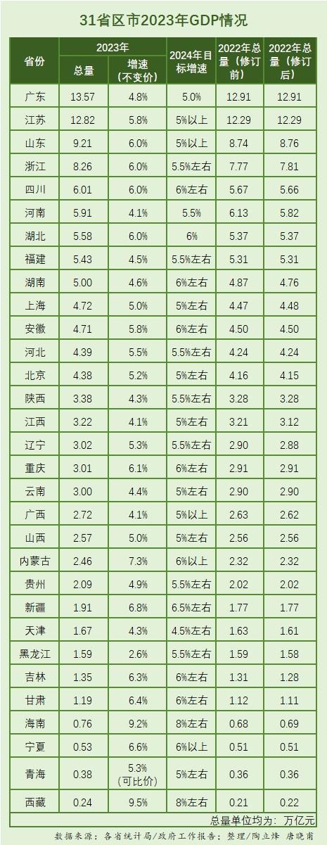 中國內地31省區市GDP情況匯總 對於2024年經濟發展的目標,30個省份將目標放在了5%左右或以上,僅有天津將增長目標定在4.5%左右。其中,西藏、海南將2024年經濟增長目標設置在8%左右,新疆6.5%左右。此外,四川、湖北、湖南等9個省份則將目標定在6%左右或以上。 【編輯:張麗欣】