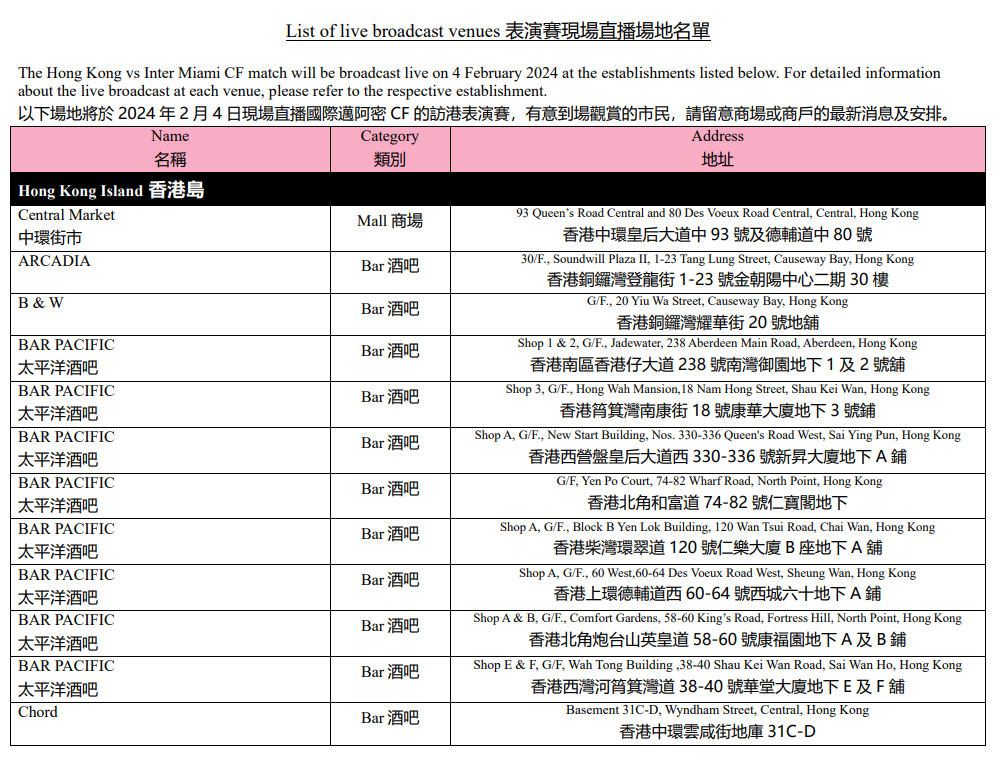 然而,表演賽一票難求,並非每位球迷都能成功搶票。有球迷便將視線落在香港富麗敦海洋公園酒店推出的套票身上。該酒店作為是次Tatler XFEST嘉年華的獨家酒店,早前推出附有賽事入場券的住宿及餐飲套票,四款套票價格由1500至5500元不等。酒店回覆查詢時表示,套票銷情接近售罄,只餘下非常少量附有表演賽事入場券的套票可供網上購買。酒店亦指,盛事期間的訂房量不斷上升,形容今次梅西訪港為酒店帶來品牌與生意的正面效應。而隨著盛事與農曆新年的接近,相信市民的消費意欲亦有所回升。 另外,中環街市、信和集團旗下奧海城、屯門市廣場亦將會在周日透過大電視高清直播賽事,讓球迷在商場感受到熾熱氣氛。