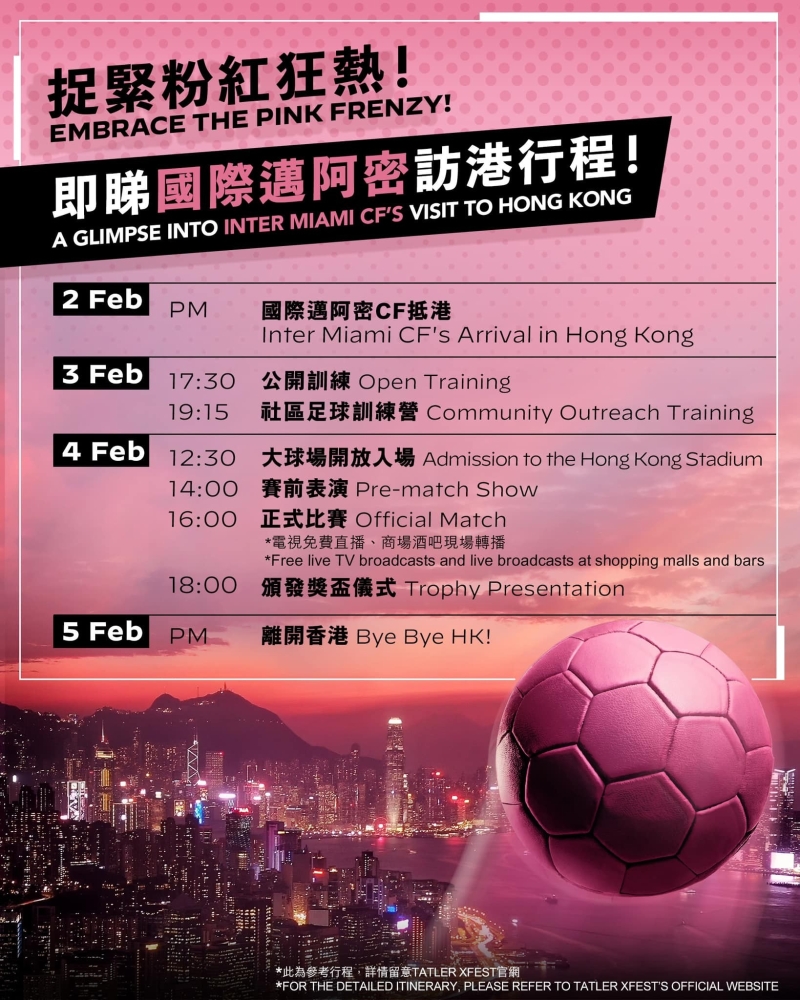 香港新聞網2月1日電 香港積極推動盛事經濟,單是今年上半年已經有逾80項大型盛事將要舉行。當中由阿根廷“球王”梅西領軍的美職球隊國際邁亞密,將於周日(2月4日)在香港大球場與中國香港隊上演友誼賽。這場萬眾期待的比賽勢必掀起一股熱潮,同時帶旺周邊的消費市道。 據了解,梅西與隊友將乘坐私人飛機,預料最快會在明天(2月2日)下午飛抵香港國際機場,屆時停機坪會舉行歡迎儀式。至於周六(2月3日)下午,國際邁亞密會在大球場進行公開訓練,隨後有慈善足球訓練環節。至周日下午4時正式在大球場上演友誼賽。據悉,球會聯合班主之一、傳奇球星貝克漢姆屆時亦會來港,並會參與部分活動。
