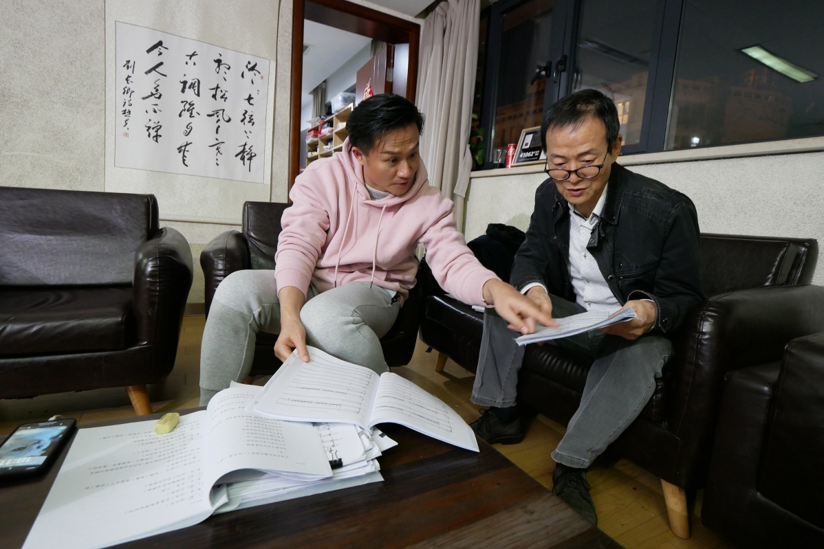 吳興國(右)、張軍研讀劇本。(圖片:香港藝術節提供)