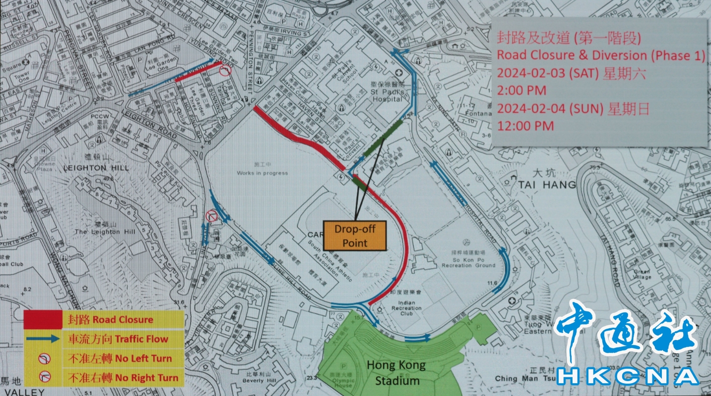 (香港中通社記者 謝光磊 攝) 至於具體交通安排,警方表示將會分三個階段實施。第一階段會由周六下午2時及周日中午12時開始,介乎棉花路與禮頓道/邊寧頓街的加路連山道北行線及南行線會封閉,銅鑼灣道封閉後前往聖保祿醫院的車輛除外;逆時針方向行駛時,介乎東院道與棉花路的加路連山道右線將會封閉,左線則維持正常;介乎開平道與恩平道的希慎道西行線會封閉;如有需要,介乎蘭芳道與希慎道的利園山道亦會封閉,專線小巴除外。 而以下路段亦會改道,包括介乎連道與大球場徑的加路連山道將改為單程南行(逆時針方向行駛);介乎大球場徑與銅鑼灣道的東院道將改為單程北行(逆時針方向行駛);介乎禮頓道與連道的加路連山道將劃出兩線讓車輛從開平道駛入加路連山道;沿連道北行線落山方向往加路連山道北行的車輛須左轉入禮頓道西行;介乎禮頓道與開平道的希慎道將改為單程東行;希慎道東行線將劃出兩線讓車輛同時右轉入開平道;離開利園一期私人車道的車輛須左轉入希慎道東行線;沿恩平道行駛的車輛不准左轉入希慎道西行,並須改經白沙道及蘭芳道;如有需要,沿蘭芳道行駛的車輛須右轉入利園山道,並須改經富明街前往波斯富街,專線小巴除外。 跑馬地分區指揮官丘傳輝表示,由於現場人數眾多,警方屆時或會考慮設置緊急通道。第二階段則由2月3日下午4時及2月4日下午2時開始,期間逆時針方向行駛時,介乎加路連花園與棉花路的加路連山道外線將會封閉,內線則維持正常;介乎加路連山道與銅鑼灣道的東院道會封閉;介乎開平道與恩平道的希慎道西行線封閉;如有需要,介乎蘭芳道與希慎道的利園山道可能封閉,專線小巴除外。