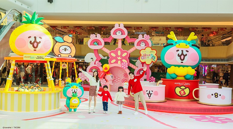 新港城中心將首度聯乘日本高人氣角色,推出打卡裝置。(圖片:主辦方提供) 今個農曆新年,馬鞍山新港城中心將首度聯乘日本高人氣角色Kanahei's Small animals,推出5大P助與粉紅兔兔的限定打卡位及2大主題玩樂園。換上龍年主題新裝的一眾角色們,將會出現在5大新春最旺打卡區,包括全港首個5米高“桃花最旺摩天輪”、“運氣最強轉轉杯”、“好事成籮金菠蘿”、“手到吉來夾夾機”及“龍年最FUN打卡牆”,在周末及假期期間“運氣最強轉轉杯”及“好事成籮金菠蘿”更會變身成開運主題玩樂區,走入裝置許願、互動玩遊戲都得! 除此之外,新港城中心更聯乘Kanahei's Small animals推出限定版利是封套裝,一套3款,龍頭、金菠蘿、桃花造型都有,寓意家庭、事業、愛情統統都順順利利! 香港仔中心“招財喵喵開運祭”