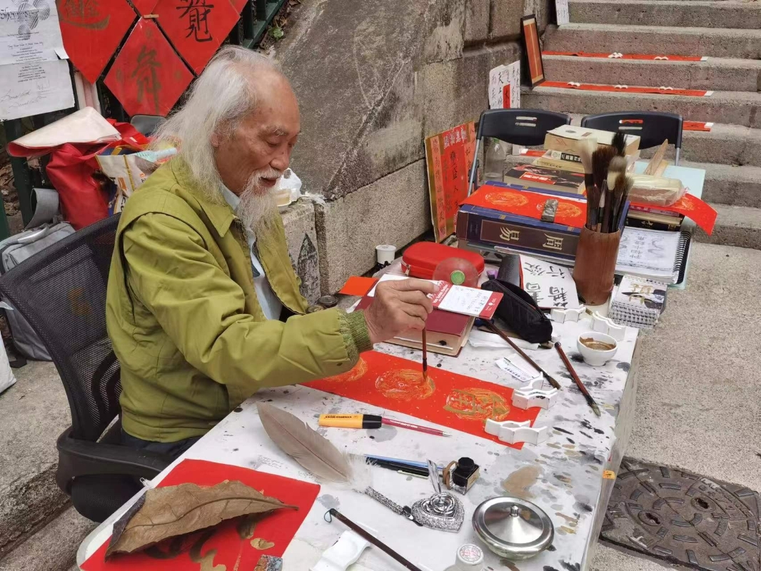 揮春是香港對春聯的叫法,揮下春天的祝福,十分形象。香港上環樓梯街附近,一個個書法攤位,放眼望去,入目皆是火紅:揮春與福字懸於街旁青灰色的墻壁上,隨風翕動。諸多攤位中,86歲的郭騰龍老先生精神矍鑠,正懸腕提起毛筆,以金墨在灑金紅紙寫下新春祝福。 若非一頭長至肩膀的飄逸白髮,單看郭老先生筆走龍蛇的架勢,很難相信這樣穩的手會是一個老人。逆鋒起筆、筆尖下頓,而後略提,邊提邊收筆,“吉祥”的“祥”字最後一豎,便似懸針般揮灑於紙上。 郭騰龍忙裡偷閒與中通社記者交談。他早在14歲時就開始學書法了。年輕時,郭騰龍開了一家水晶玻璃廠,儘管天南海北跑業務,但閒時仍堅持練字。退休後,郭騰龍終於有時間全心全意投入書法。 攤位附近匯聚了市民遊客觀看,更引得不少海外友人駐足。“Welcome to take pictures(歡迎來拍照)! ”郭老笑著和人攀談。他說,不少來自英國、法國的遊客,都找他寫過揮春,自己也想將這項中華文化弘揚、傳承出去,因此也免費指導寫書法。 街巷附近,“噼里乓啷”的施工聲不斷響起,但回望一個個寫揮春的攤主,手上的動作穩如泰山。遊客曾先生圍觀許久向記者感慨:“施工聲也影響不到他們,老先生真是功底深厚啊。”他憶述,現如今內地不少揮春都是機器印製,很難看到街頭即場寫就的書法作品。 郭先生的長方桌,一本周易格外引人注目。 為何寫書法還需要看周易呢?郭騰龍告訴中通社記者,這是由於自己在寫作時,會參考傳統文化。如周易原文“飛龍在天,利見大人”,便是極好的意頭。 正值龍年,一幅“飛龍在天”,恰恰應了市民遊客對新年的美好祈願。 不到半個小時,郭老已一對接一對地寫了兩三副揮春,市民遊客絡繹不絕地向郭騰龍預定作品。一名自湖南來港讀書的學生,也打算找郭先生寫一幅作品,等過年回家時,好將這“跋山涉水”的吉祥意象,紅火地掛在家門前。 (完) 【編輯:陈卓仪】