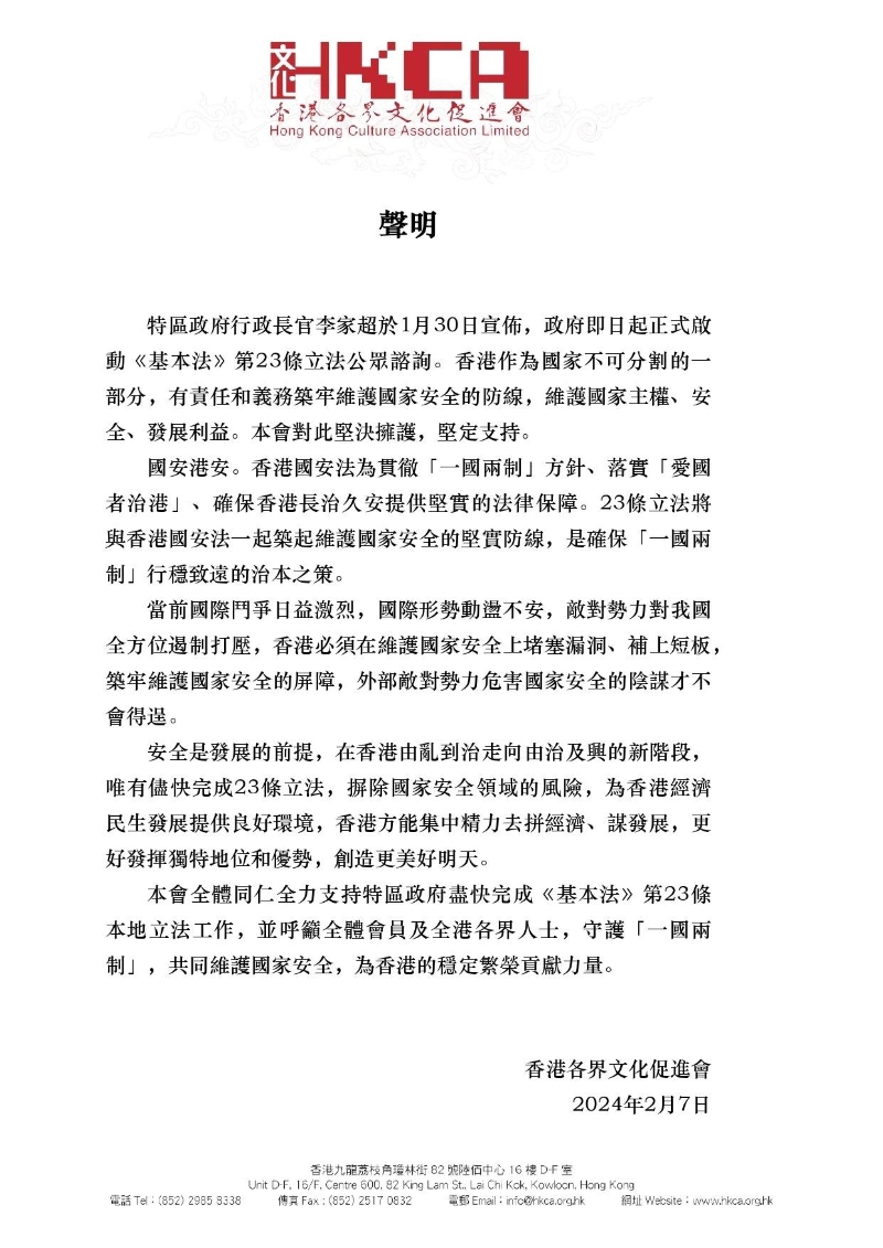 香港新聞網2月8日電 香港各界文化促進會7日發表聲明,全力支持特區政府盡快完成基本法第23條本地立法工作。聲明全文內容如下: 特區政府行政長官李家超於1月30日宣饰,政府即日起正式啟動基本法第23條立法公眾豁詢。香港作為國家不可分割的一部分,有責任和義務築牢維護國家安全的防線,維護國家主權、安全、發展利益。本會對此堅決擁護,堅定支持。 國安港安。香港國安法為貫徹“一國兩制”方針、落實“爱國者治港”、確保香港長治久安提供堅實的法律保障。23條立法將與香港國安法一起築起維護國家安全的堅實防線,是確保“一國兩制”行穩致遠的治本之策。