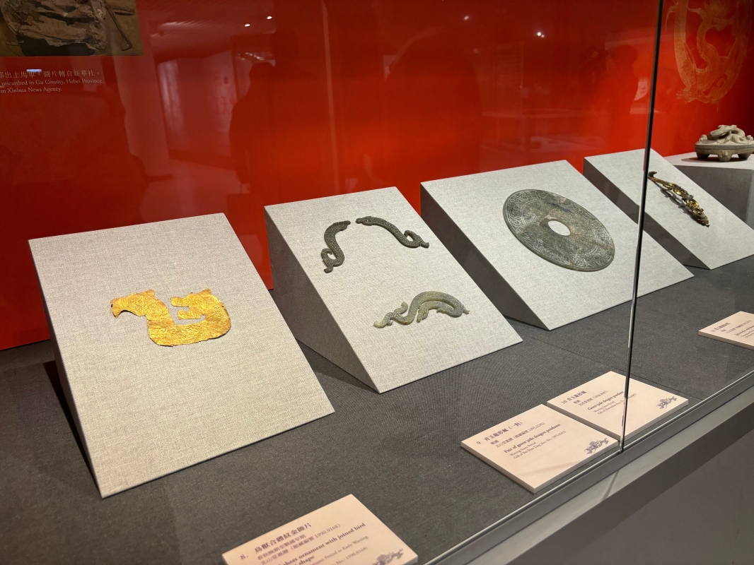 展場一隅。(香港中通社記者 黃璇攝) 展出的逾50件館藏文物,涵蓋玉石、骨刻、金器、青銅器、陶瓷、石刻、絲織、文房、拓本等類別,包括設計文物館館徽時參考的西漢“綠松石雙面肖形印”、五代至北宋“白玉團龍紋穿心盒”、傳奇督陶官唐英自製“墨彩雲龍紋筆筒”等精品,為甲辰新春誌慶。 展廳及展品的布局按照朝代分布,上至新石器時代至商周,下至明清兩朝至近現代。觀眾徜徉其中,一目了然就能感受到在漫漫歲月長河中,龍形象變化與文化民俗之間千絲萬縷的聯繫。 【重點展品推介】 夔龍象紋方座銅簋