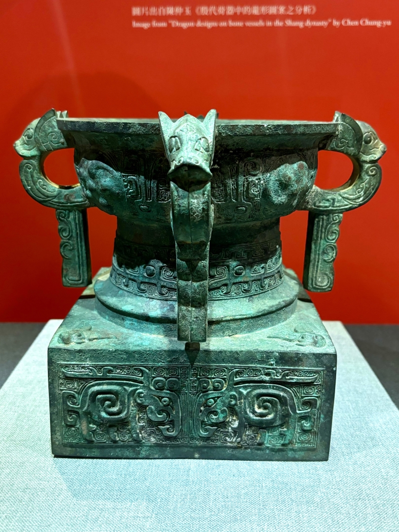 夔龍象紋方座銅簋。(香港中通社記者 黃璇攝) 銅簋為西周早期的食器,其底座的紋路沿襲商周龍紋特色,不易辨認。青銅器中常見的獸面紋,又或者是張口突目的怪獸,都被認作是龍的一種。 鳥獸合體紋金片飾