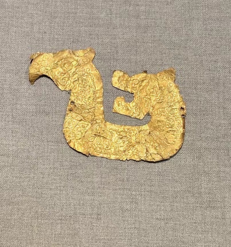 鳥獸合體紋金片飾。(香港中通社記者 黃璇攝) 出自春秋晚期至戰國早期,鳥獸合體展示當時遊牧民族對龍形象之影響,其藝術中的狩獵圖、鷹獸合體等表達手法,令龍紋也開始出現了撕咬、相互纏繞及鷹合體等。 走龍紋磚