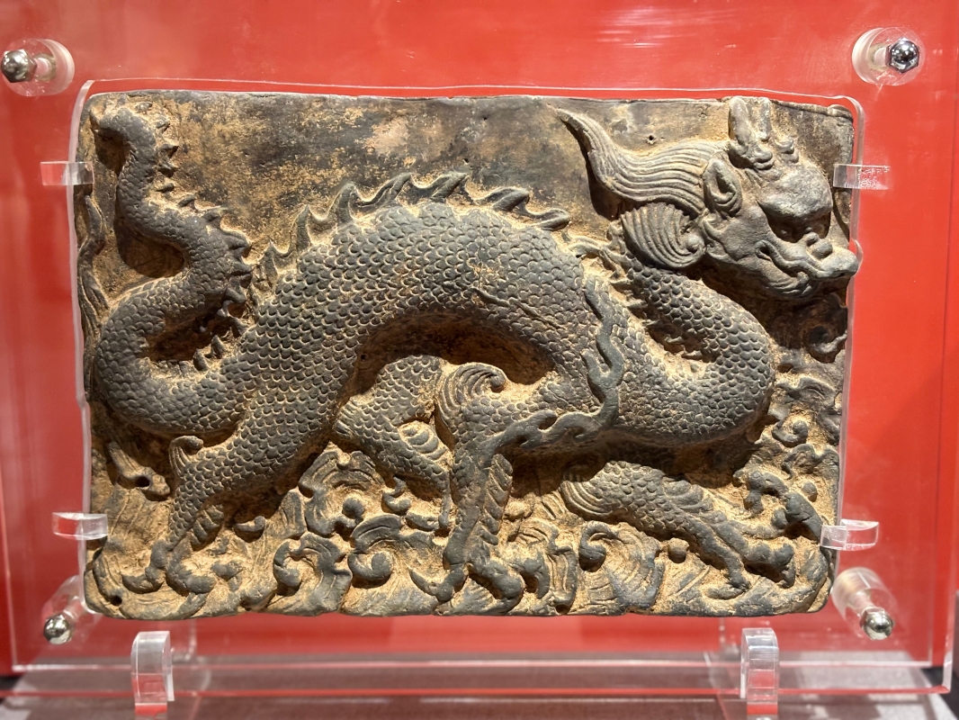 走龍紋磚。(香港中通社記者 黃璇攝) 這件磚石體現龍形象逐漸褪去了“獸性”,與早期的龍紋飾相比,宋代的龍開始變得憨厚、豐腴起來。因為當時的市民階層也十分喜愛龍形象,故這時期的龍在爪的數量、鼻的形狀、額頭大小等,表現得更為溫和,龍的特徵也慢慢變得接近於人、“更加有人性”。 青花雲龍紋大缸殘片