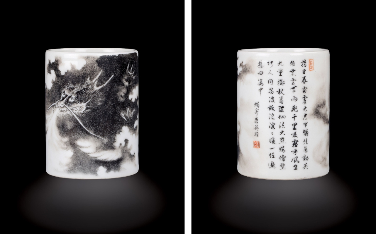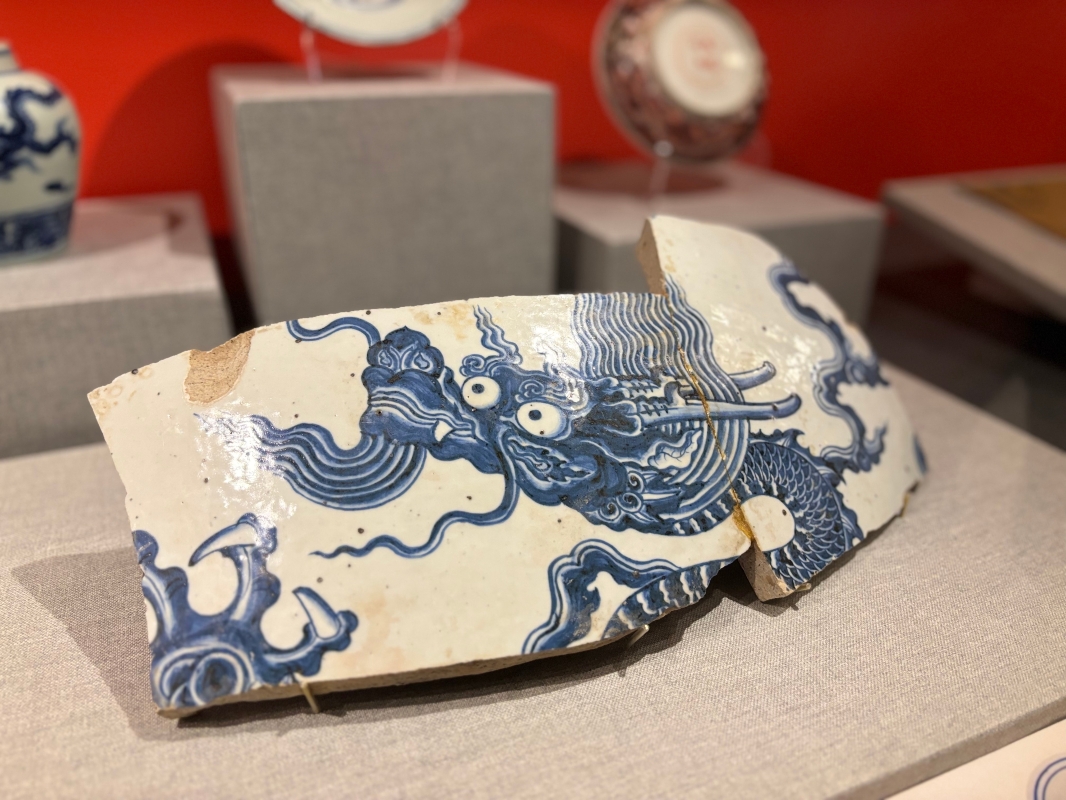青花雲龍紋大缸殘片。(香港中通社記者 黃璇攝) 經深入研究所得,殘片原為一個非常大的龍瓷缸。考古學家認為,如此大型的龍缸,不見於較早的宣德或稍晚的成化官窯,看來是屬於正統朝特有的器型。 墨彩雲龍紋筆筒
