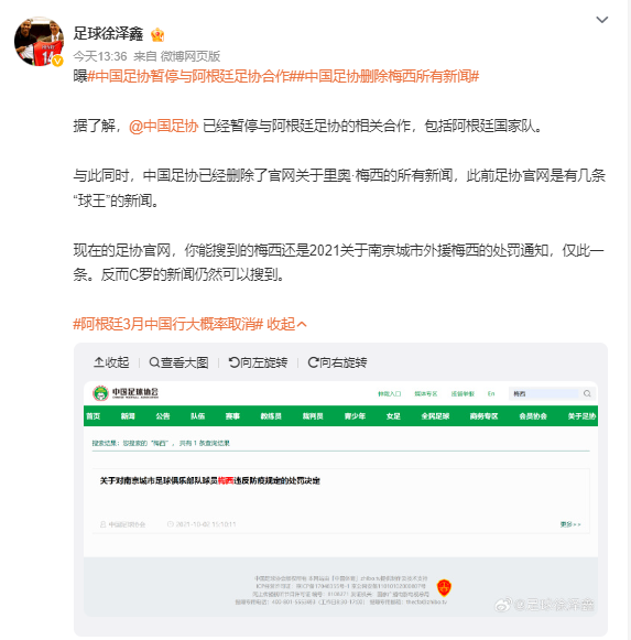 中國足協已暫停與阿根廷足協合作,刪除梅西所有新聞分享到: