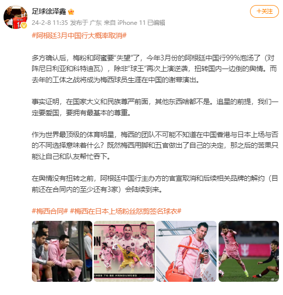 阿根廷3月中國行大概率取消 2月8日,徐澤鑫發文稱,“多方確認後,梅粉和阿蜜要‘失望’了,今年3月份的阿根廷中國行99%泡湯了(對陣尼日利亞和科特迪瓦),除非‘球王’再次上演逆襲,扭轉國內一邊倒的輿情。而去年的工體之戰將成為梅西球員生涯在中國的謝幕演出……”