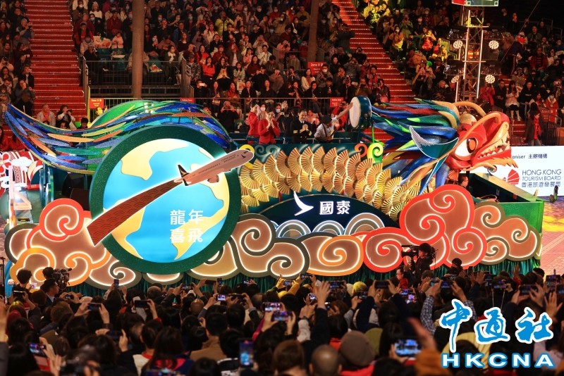 香港中通社2月10日電 (香港中通社記者 徐嘉儀)大年初一,龍騰香江。甲辰龍年第一天,國泰新春國際匯演之夜睽違五年再度亮相,別開生面的花車巡遊及表演在香港尖沙咀上演,與市民共賀新歲。 當天,濃霧籠罩多天的香港,從小雨轉天晴,和風煦煦,給龍年開了個好頭。下午6時許,夜幕降臨,維港燈火初明。中通社記者抵達尖沙咀看見,從彌敦道到海旁一帶陸續聚集大批提前到來的市民和遊客,引頸以待花車出場。 尖沙咀街頭有多個團體在巡演開始前表演花式足球、街舞、芭蕾舞等,率先與觀眾互動,氣氛熱了起來。 晚上8時許,主角登場,巡遊揭開序幕。9部花車接連出場,各有特色,有翱翔雲間的時尚龍、融入紫荊花元素的吉祥龍;也有結合揮春、炮仗等賀年元素的遊樂園和城市景觀裝置,年味十足;還有花車呈現以龍身穿梭香港著名街景和摩天大廈的場景,寓意龍躍在港。