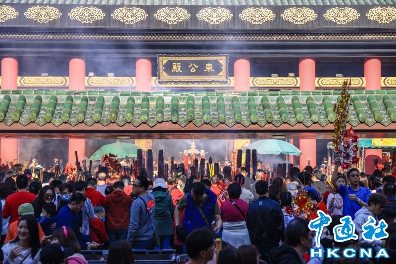 香港新聞網2月11日電 新年行大運,11日是大年初二,香港市民有到沙田車公廟參拜、求籤的習俗。從當天早上8時至中午12時,沙田車公廟錄得逾1.6萬人次入廟,廟內香火鼎盛。