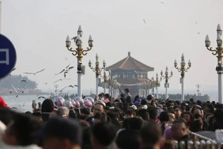 青島 2月10日大年初一,青島知名景點棧橋,人擠得是里三層外三層,有網友戲稱:“去年的今天我還有站在棧橋上被人踩掉鞋的權利,今年只能站在老遠乾瞪眼了。”