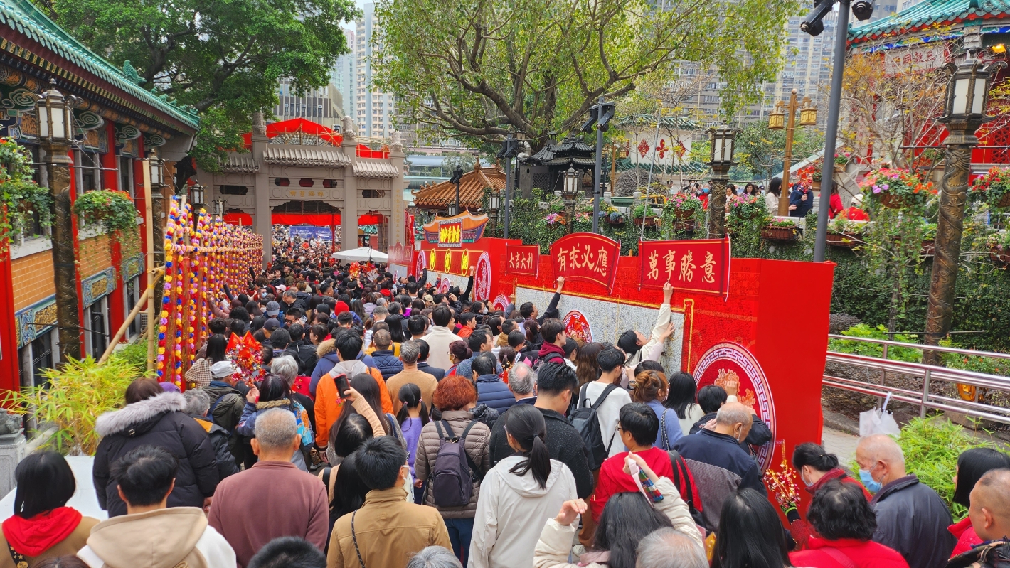 人們在黃大仙祠祈求新的一年事事順利。 中通社圖 從大年初一開始,香港的新年就出現了人海潮,從黃大仙祠到林村許願樹,人們紛紛虔誠許願。不少善男信女會在大年初一到黃大仙祠上頭炷香,祈求新的一年事事順利。不可勝計的善男信女摩肩接踵,爭先恐後地在神像前上香許願。大年初二車公誕,香港市民按照傳統到車公廟參拜。不少人手上都拿著風車,意寓“風水好,貨如輪轉,好運一齊來”。而花車巡遊和煙花匯演更是吸引到了很多遊客助興農曆春節。