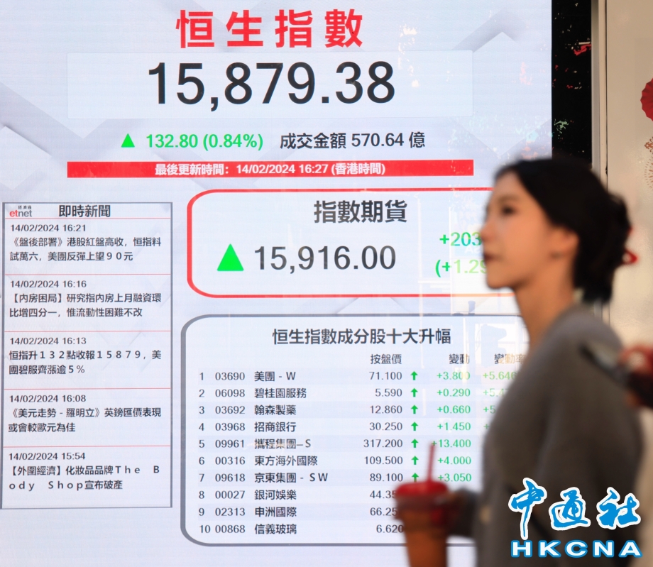 港股龍年首個交易日紅盤高收香港新聞網2月14日電 2月14日為港股龍年的首個交易日,恒生指數成功以紅盤高收,全日升132點,實現連續第五個龍年首個交易日上漲。 恒指全日升132點,升幅0.84%,收市報15879點,主板成交額近571億港元。國企指數升79點或1.5%,報5386點。恒生科技指數漲70點或2.3%,報3197點。多隻互聯網科技股造好。其中,美團新春外賣訂單錄得明顯增長,收市升5.6%,為表現最好藍籌。騰訊升約1%,報290元。阿里巴巴升2%,報70.8元。而藥明生物跌逾9%,藥明康德跌超18%,是全日跌幅最大的兩隻藍籌。