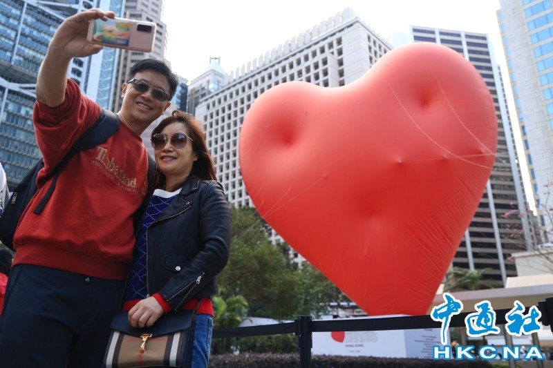 香港中通社2月14日電 題:情人節快樂!維港紅心裝置甜意濃 香港中通社記者 陳卓儀 “情人節快樂!”2月14日大年初五是中國農曆年迎財神的日子;對於情侶來說,這天也是要“散財”的西方情人節。當天不少情侶趁著午休時間的好天氣,在海濱舉花拍照,其中最受歡迎的打卡位是一顆懸浮在空中的大紅心。