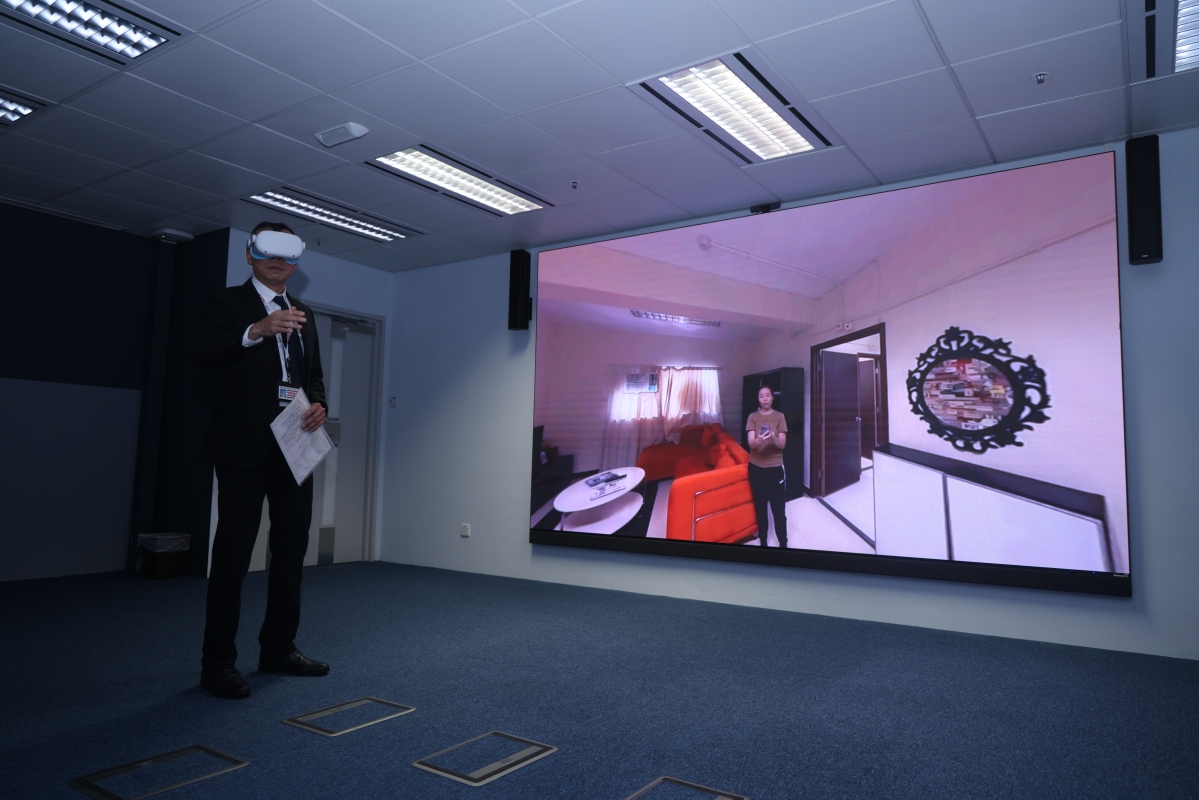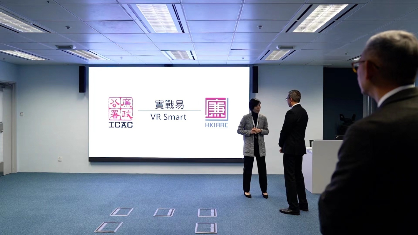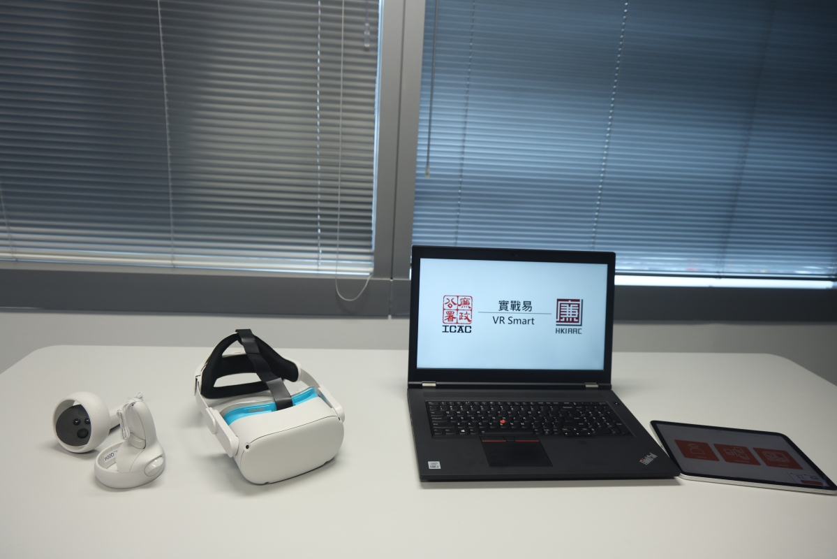 “實戰易”系統。香港中通社圖片 中通社記者在香港國際廉政學院看到培訓導師及學員的演示過程。學員戴上頭戴顯示器,即可身處模擬的執法現場,培訓導師因應學員的表現及時發出指示。 當日,“實戰易”模擬了一名工程公司負責人向建築署一名工程師行賄,以換取批出工程合約,廉署執法人員上門搜查的情景。廉署人員在嫌疑人住處外,負責人應門時,廉署人員即按程序表露身份、上門目的及展示法庭搜查令,進入單位後隨機確認嫌疑人身份,宣讀所涉罪名及疑犯權益,制止疑犯妻子用手機拍攝執法人員等。