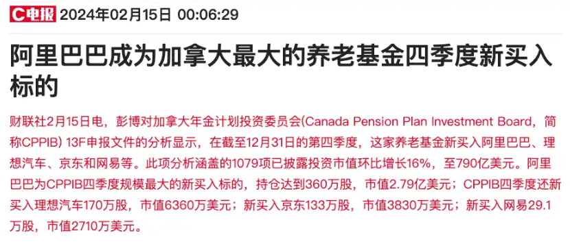 香港新聞網2月15日電 多家美股投資機構在近日披露的13F持倉報告顯示,投資者對阿里巴巴(09988.HK;BABA:NYSE)的興趣正在昇溫。 今天的一則消息引發投資者關注,資料顯示,阿里巴巴成為了加拿大最大養老基金CPPIB去年四季度規模最大的新買入標的,持倉達到360萬股,市值2.79億美元。