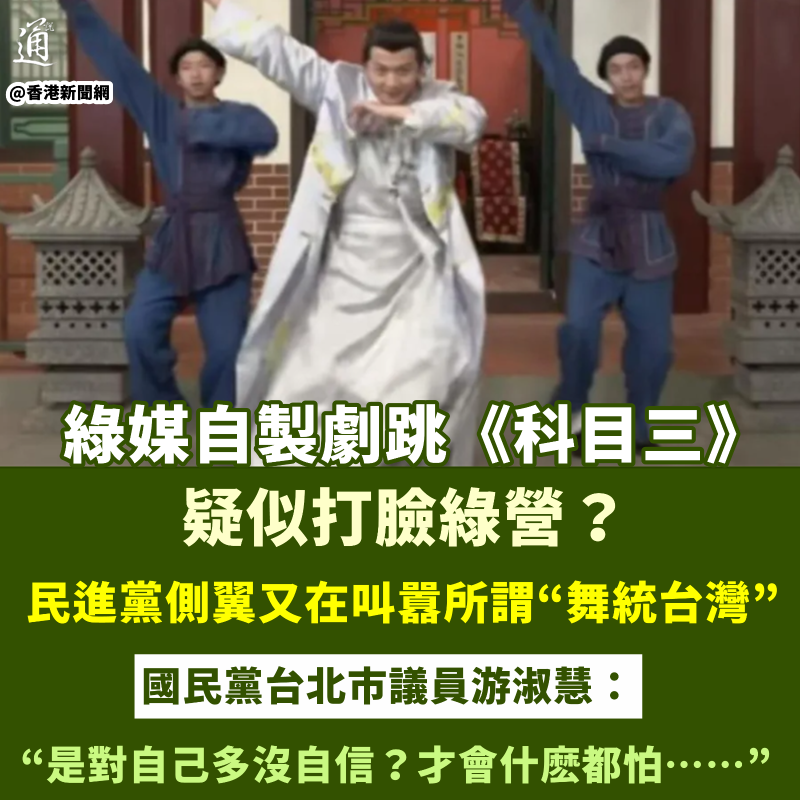 香港新聞網2月15日電 抖音神曲《科目三》及其舞蹈爆紅全網,這股風潮當然也刮到了台灣,不少民眾紛紛模仿跟跳,台北寧夏夜市也舉辦了“科目三舞蹈比賽”賺足眼球。 但此現象卻被民進黨及其側翼抹黑為大陸通過互聯網所謂滲透“認知作戰”,甚至形容台灣年輕人跳《科目三》是所謂“舞統台灣”。 沒想到的是,連自家人也抵擋不住《科目三》的魅力,大炫舞技博流量。 近日,台灣綠媒“民視”古裝單元劇《台灣傳奇》在劇情中加入大跳《科目三》的橋段,引發廣泛討論。不少綠營人士又開始上綱上線,直呼所謂“舞統台灣”成功了,連自己人都要跟風。 不知是否受到壓力,目前《台灣傳奇》中這段大約10秒的《科目三》片段已經被刪減,“悄悄被消失”。如此心虛的作法,讓國民黨台北市議員游淑慧忍不住感歎:大可不必!