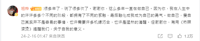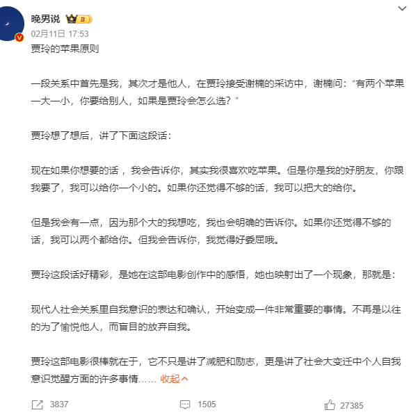 微博圖片 杜樂瑩的妹妹與她不和,不僅時常侮辱她,還想要她把房子過戶給自己;杜樂瑩的表妹為了自己在電視台轉正,設計女主上節目,還惡意剪輯侮辱女主;杜樂瑩的閨蜜搶了她的男友……對於這樣的角色,電影中既沒有鼓勵,也沒有批判,只是向大家展示出:你看,社會一直有這樣的存在。 “賈玲和熱辣滾燙的出現完全顛覆了向男性審美妥協。”也有網友這樣說,賈玲的電影展現出女性主義的覺醒。 學會愛自己才是核心 “以前的女主處處遷就別人,現在的她更關注的是自己。學會愛自己,其它的愛誰誰,這才是熱辣滾燙想要傳達出的核心。”一微博網友這麼說。 賈玲的蘋果理論也登上微博熱搜榜:一段關係中首先是我,其次才是他人。這也折射出,現代人在社會關係裡自我意識的表達和確認,開始變成一件非常重要的事情。 其實,生活賦予我們太多的角色,也帶了許多枷鎖,賈玲也在告訴我們,我們可以是任何樣子的,但也要好好愛自己。 正如路演結束了,賈玲16日凌晨發的那條微博。她說,“我曾幻想誰會駕著七色雲彩來拯救我,過了好久我終於等到他,才發現我面前是一面鏡子。能拯救我的只有我自己。我愛我的懦弱,我愛我的善良,我愛我的不知所措。” 置死地而後生的勇敢和堅毅 網絡上,不少網友分享觀影體驗。 “她刻畫的是置死地而後生的勇敢和堅毅!就像賈玲自己說的:我不是瘦了,我是變強了!” “看花絮的時候,我一下子就哭了”。當賈玲的減肥日記作為彩蛋在大屏幕上滾動時,一直堅持減肥的觀影者被賈玲的意志感動到爆哭。