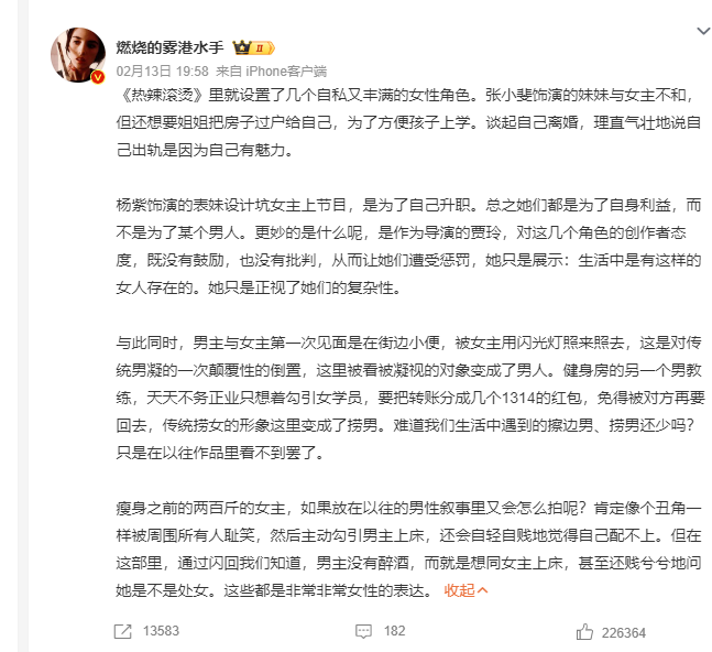 微博圖片 《熱辣滾燙》為觀眾講述了脫離社會、封閉社交圈層的女生杜樂瑩,在命運幾番捉弄下,決定要換一種方式生活,並通過拳擊舞台找回自我,實現人生蛻變的故事。 聽起來耳熟能詳的劇情,將人拉回23年前上映的香港喜劇電影《瘦身男女》中,觀影前觀眾難免擔心電影又落入俗套。不過,票房會說話。 一如當年橫空出世的《你好,李煥英》,《熱辣滾燙》自上映後穩居內地微博熱搜榜單,票房也一路領跑,截至2月16日0時,票房突破23億,有望再度在今年新春賀歲檔奪冠。 但與《你好,李煥英》票房口碑雙豐收不同,《熱辣滾燙》熱度背後,爭議也隨之而來:這不就是一部減肥的電影嗎? 儘管賈玲多次說不希望觀眾認為這是一部關於“減肥”的電影,但可惜的是,由電影宣傳定檔上映至今,“減肥”、“賈玲瘦了”始終是繞不開的話題,這確實也難免讓部分網友認為這部電影是以“減重”為噱頭反復炒作。 不過,這部電影真的減肥這麼簡單嗎? 角色刻畫展現女性主義覺醒 有人說這是一部女性題材作品,是一個女性成長故事,也展現出女性創作者獨有的細膩。並非只有十全十美的英雄式角色才更觸及人心,在賈玲刻畫下,“好”和“壞”不再是單純足以刻畫人性的形容詞,這些角色是複雜的而有層次的。