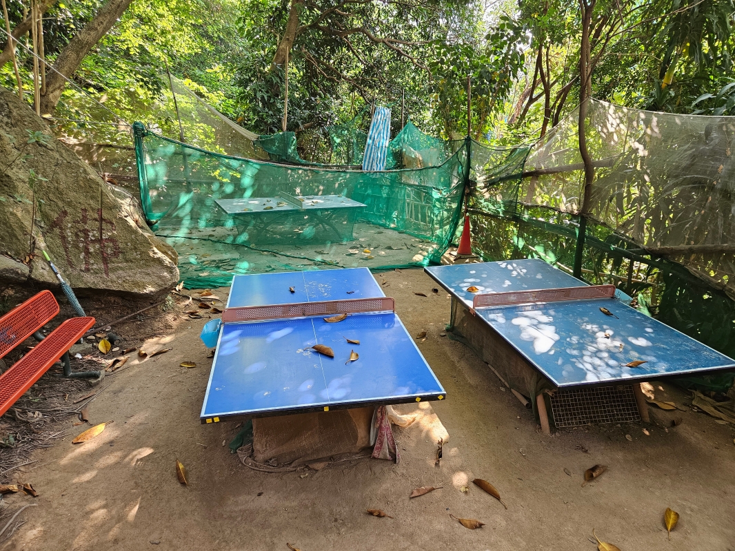窩仔山上擺放了大量的乒乓球桌,因此這裡也被稱作“乒乓山”。(香港中通社記者 黃璇攝) 走過300多級樓梯,未到配水庫入口,是被花崗石封了的配水庫隧道口,百年前水管的出入水位置。地上草皮之間,是上了年頭的井蓋,走近仔細觀察,井蓋上的英文字昭示著它的歲月,原來這口井的製造年代可追溯至19世紀。