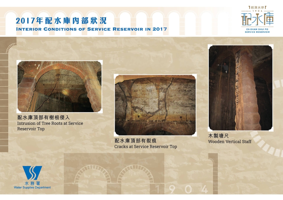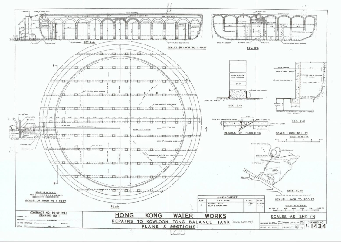 1951年配水庫維修圖則。 配水庫內空間不算太大,半小時內可以參觀完畢,不消一會就走到出口樓梯。樓梯旁除了橫放了一條12吋直徑出水管之外,還有位處入水口的垂直式鐵製靜水井,主要用來限制進水浮波閥的浮波上下浮動的位置和上下移動速度。在靜水井上方是二條12吋直徑水管,分別是進水管和溢流管。 從2020年底發現這處遺蹟到今時今日,配水庫的陳列,及保存完整性,可感香港水務署之努力,諸如在配水庫外露部分加裝玻璃天窗,用以加固及保護建築結構,參觀者使用的樓梯也很是堅固,據說當時的工作人員會站在扶梯之上查看配水庫水位高低。此外,行人經過的路線還設有風扇和相應的通風以及消防設備,諸如此類。 伴隨時間發展,今日的深水埗配水庫雖然沒了往日的功用,但它並未真正遠離人們生活。今人漫步其中,不僅可以欣賞建築特色,更可了解香港水務發展歷史,它是活生生的歷史證明。 【編輯:黃璇】