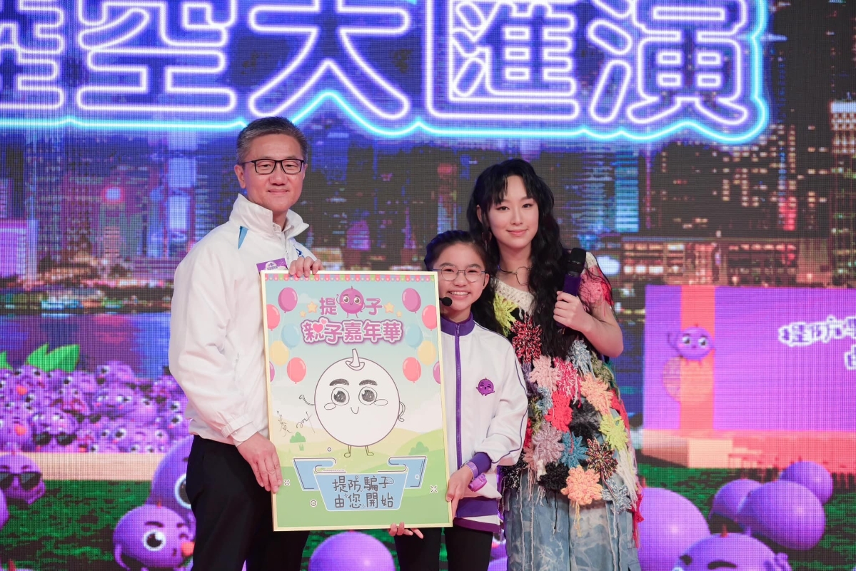 警方FB圖片。 重頭戲之一是昨日舉行的“提子海陸空大匯演”,由1200隻無人機在維港上空呈獻歷時12分鐘的“提子幼兒繪本天空秀”,主題是《提子與我:提防騙子》故事,內容講述大灰狼偽裝為不同的“親友”想欺騙“提子”,但被醒目的“提子”識破騙局,以宣揚防騙訊息。 警務處處長蕭澤頤昨日出席“提子海陸空大匯演”致辭時表示,香港去年騙案數字有近4萬宗,涉及的損失金額超過91.8億元,當中近60億元(即約三分二)涉及投資騙案。他希望透過今次活動能讓“提子”走進社區,提醒公眾,特別是小朋友時刻提防騙子。