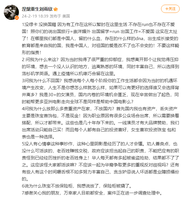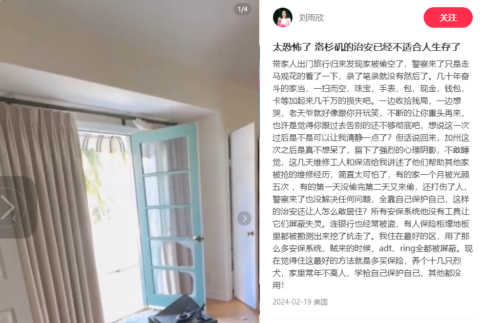 圖片源自劉雨欣的小紅書 她在文中還稱:“加州這次之後是真不想呆了,留下了強烈的心理陰影,不敢睡覺,這幾天維修工人和保潔給我講述了他們幫助其他家被搶的維修經歷,簡直太可怕了,有的家一個月被光顧五次 ,有的第一天沒偷完第二天又來偷,還打傷了人,警察來了也沒解決任何問題,全靠自己保護自己,這樣的治安還讓人怎麽敢居住?所有安保系統有工具讓它們屏蔽失靈。連銀行也經常被盜,有人保險櫃埋地板裏都被勘測出來挖了扛走了。我住在最好的區,用了那麽多安保系統,賊來的時候,adt、ring全都被屏蔽。現在覺得住這最好的方法就是多買保險,養個十幾只烈犬,家裏常年不離人,學槍自己保護自己,其他都沒用!” 據劉雨欣在評論區透露,她住在比弗利,已報警但沒結果。比弗利山莊(Beverly Hills)位於美國洛杉磯,有“全世界最尊貴住宅區”稱號,被人們稱為財富名利的代表和象征。作為洛杉磯市內最有名的城中城,這裏有全球最高檔的商業街,也雲集了好萊塢影星們的眾多豪宅。 19日晚,劉雨欣在微博發文,回應了部分網友的質疑,其中提到她目前沒拿綠卡,沒換國籍。